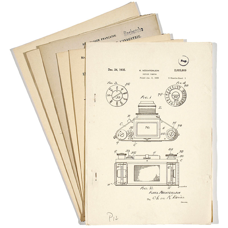 6份专利说明书,1934年到1958年之间,其中有2份德国的、2份瑞士的、1份法国的还有1份美国的,以及Karl Nüchterlein. 其主题是,反射式照相机,梯形样图,可取换的取景器等等