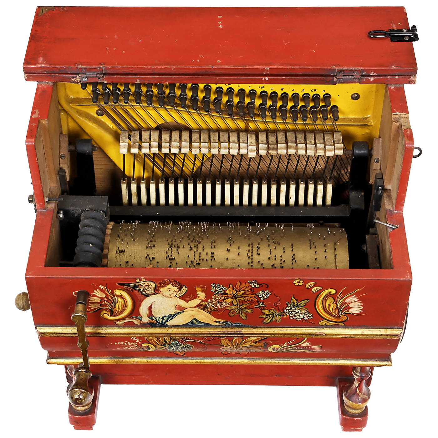 Made by Antonio Martin, Madrid, España. Serial no. 7705, barrel with 6 melodies (popular songs), 23 keys, cast-iron frame, crank-operated, tune-change crank with indicator, colorfully painted wood case, overall size 19 ¾ x 11 x 18 in. - Playing condition, in need of tuning.
