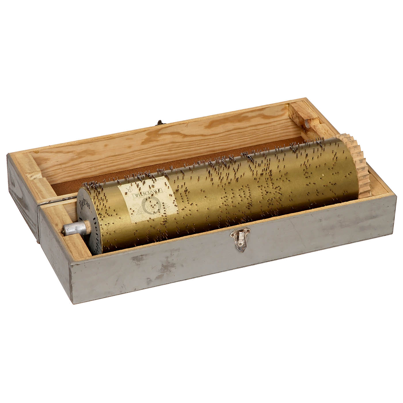 No. 41205, playing eight lively popular and operatic airs, including "Faust" and "Dinorah, Ombre Légère", accompanied by five optional finial-topped bells and two dancing bisque dolls in original costumes, with 58 teeth in comb (complete), comb rosettes, Brunswick Lion stamp, tune-sheet and grained case with original finish and inlaid lid, wd. 21 ¾ in. (55,5 cm), cylinder 8 in. (20 cm), good playing condition, however spring in need of attention - possibly shortened.