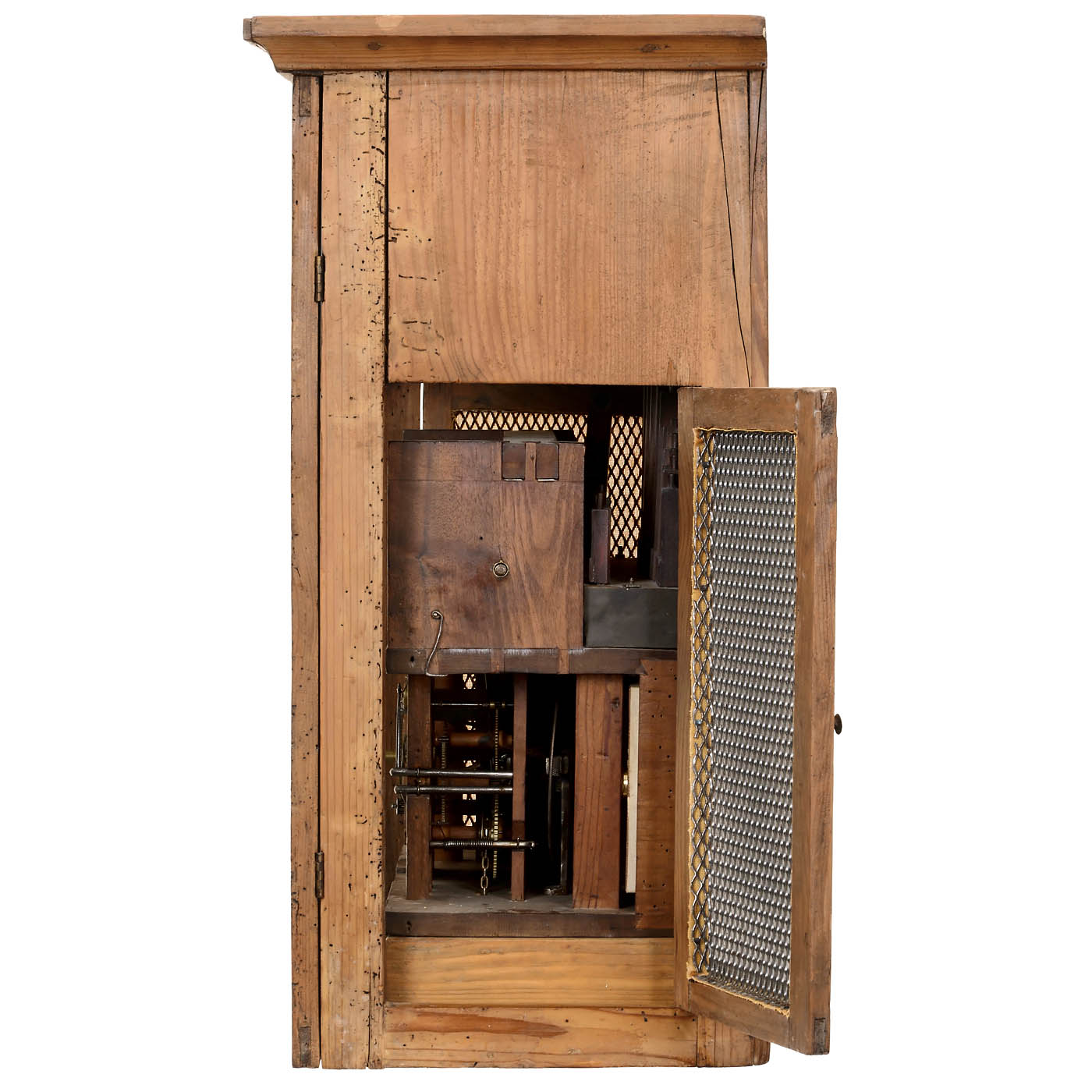 Painted arched dial depicting Tsar Alexander I, pinned wood barrel with 8 melodies, 23 notes, wood-plate movement with brass wheels, hour strike on spiral gong, wood case, 20 ½ x 13 1/3 x 27 ½ in., with weights and pendulum, working but plays too softly.