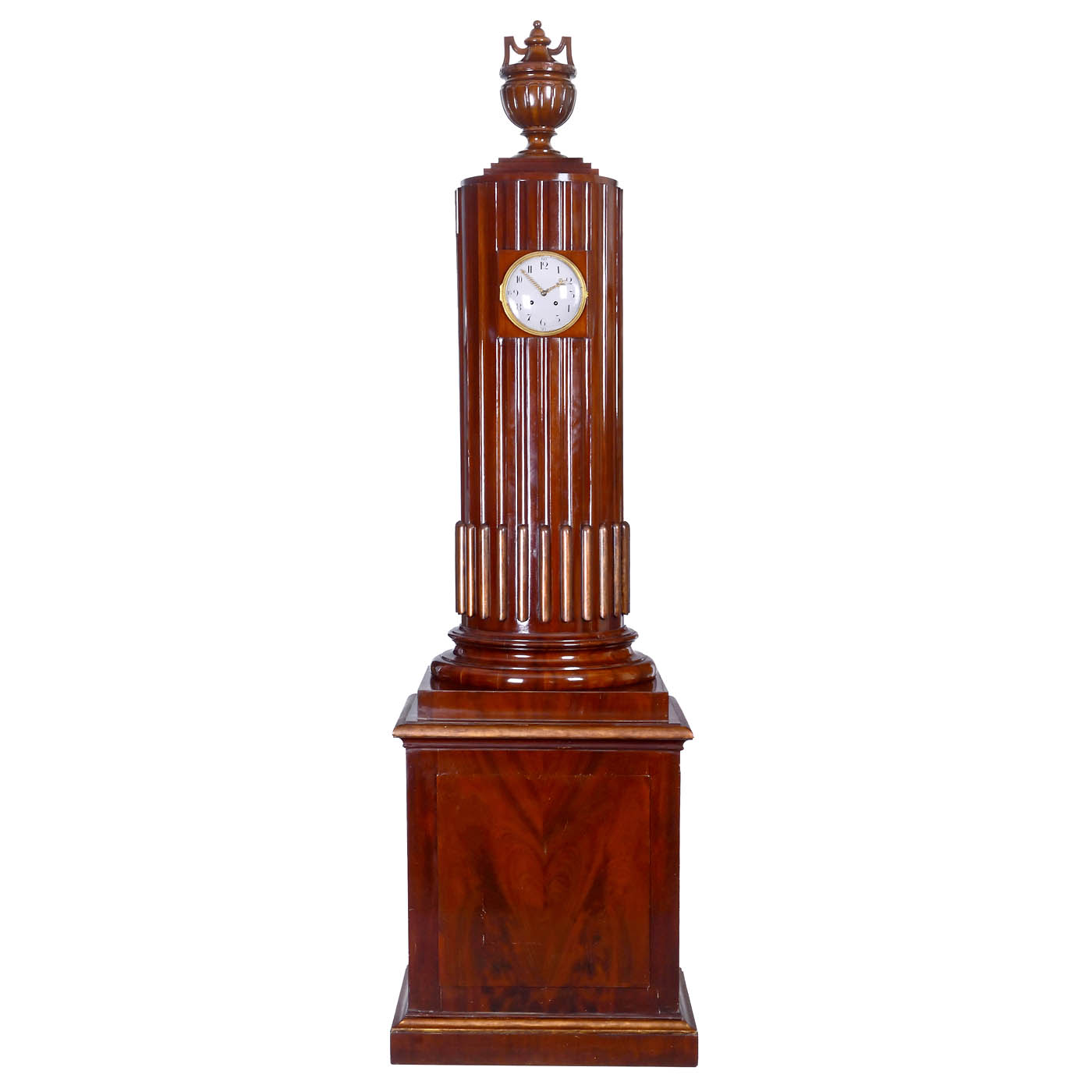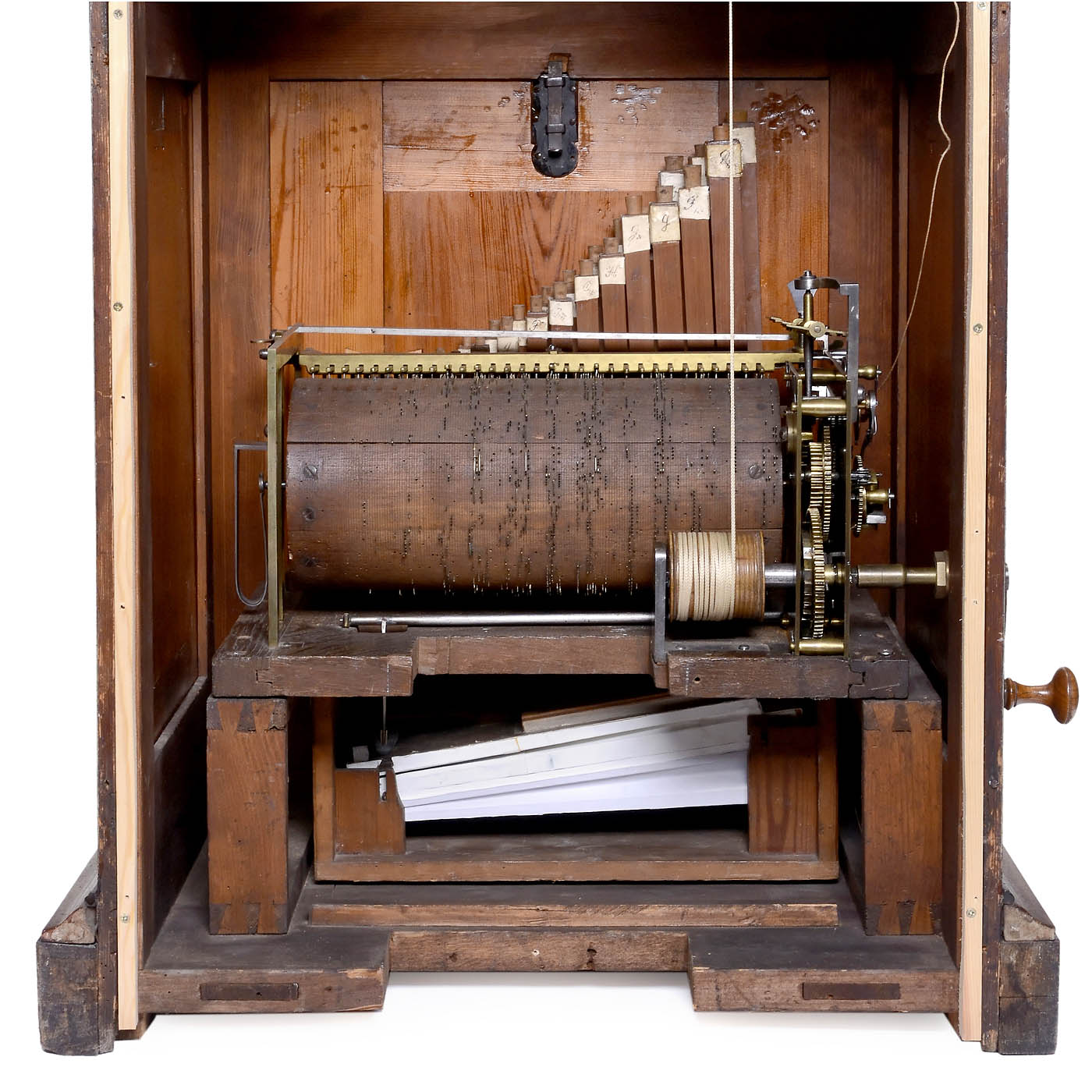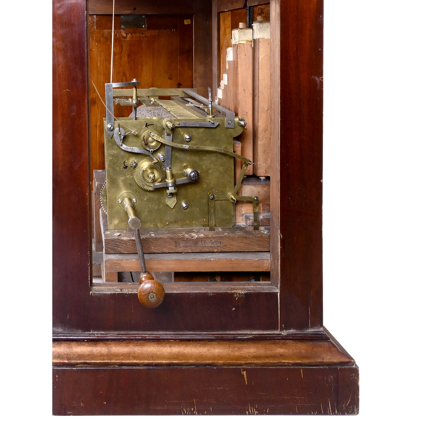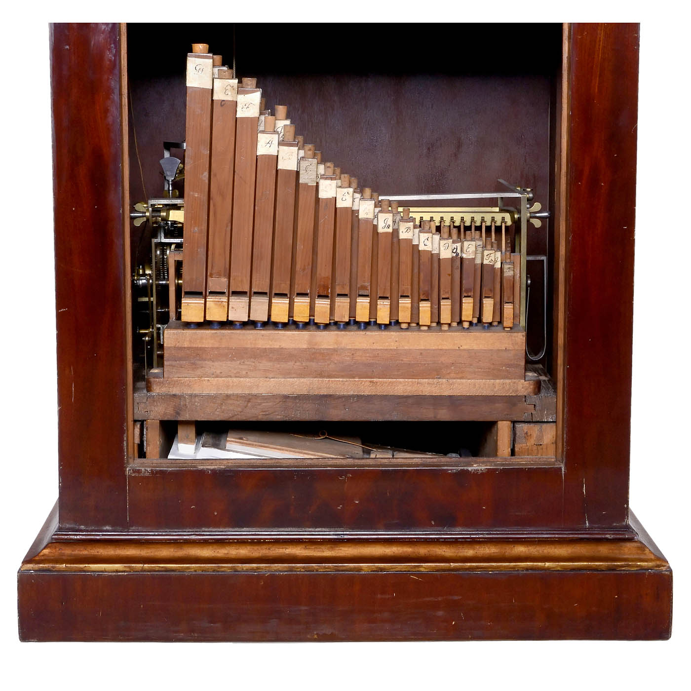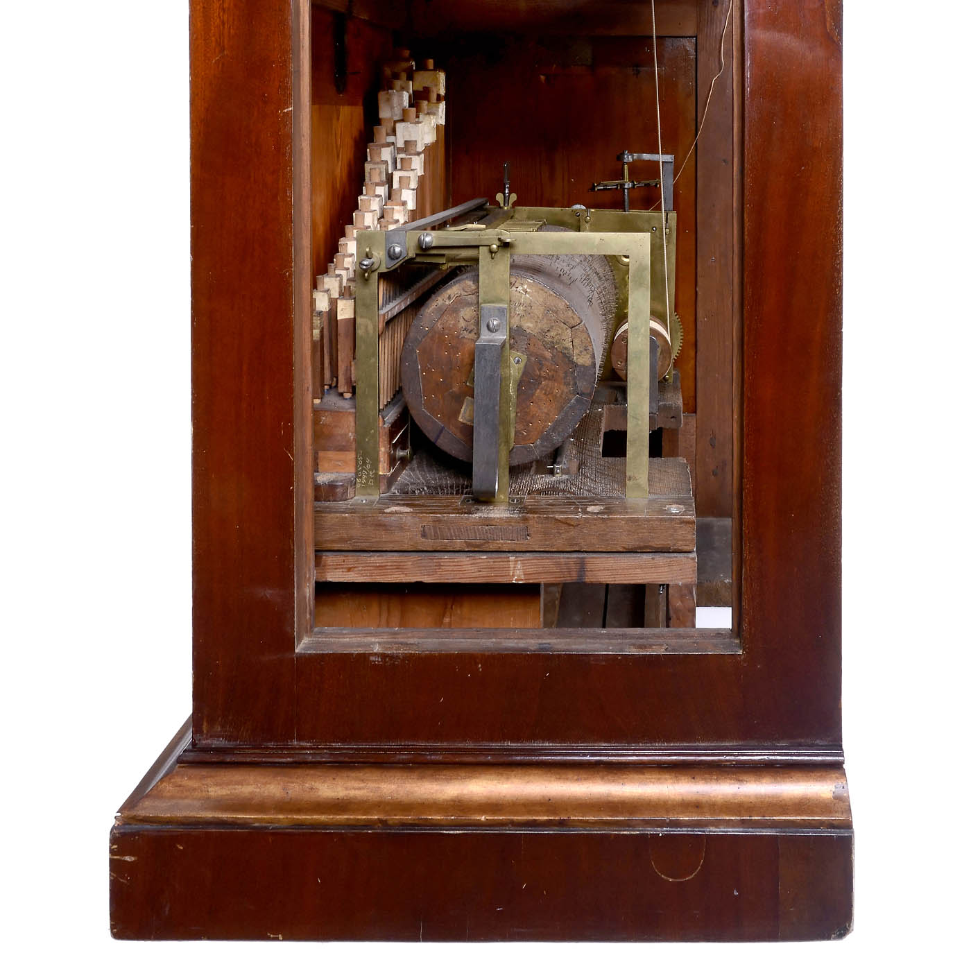 Probably by Christian Ernst Kleemeyer, Berlin. With weight-driven brass organ movement, 6-air 14 ¾-inch (37,5 cm) pinned wood barrel with 31 pipes in two rows, enameled Arabic dial, Ø 7 in., two-train time movement, hour strike on bell, cherrywood case, size 27 x 19 5/8 x 99 in. Working, plays a bit soft. - Attributed to Christian Ernst Kleemeyer (born c. 1739), court clockmaker to the Prussian king Friedrich Wilhelm II. -Organ clocks by Kleemeyer are to be found in the Museum of Musical Instruments of the University of Leipzig and the Musical Instrument Museum in Berlin. Signed examples of his work include musical secretaires and clocks with architectural elements, such as the example seen here. - Literature: http://quellen.perspectivia.net/bestaende/spsg- schatullrechnungen/personen/p2694. - Helmut Kowar, "Mozart and Mechanical Music", in: "Journal of Mechanical Music", Spring 1992, p. 27, for a very similar (if not identical) piece. - An early and impressive instrument worthy of exhibition.