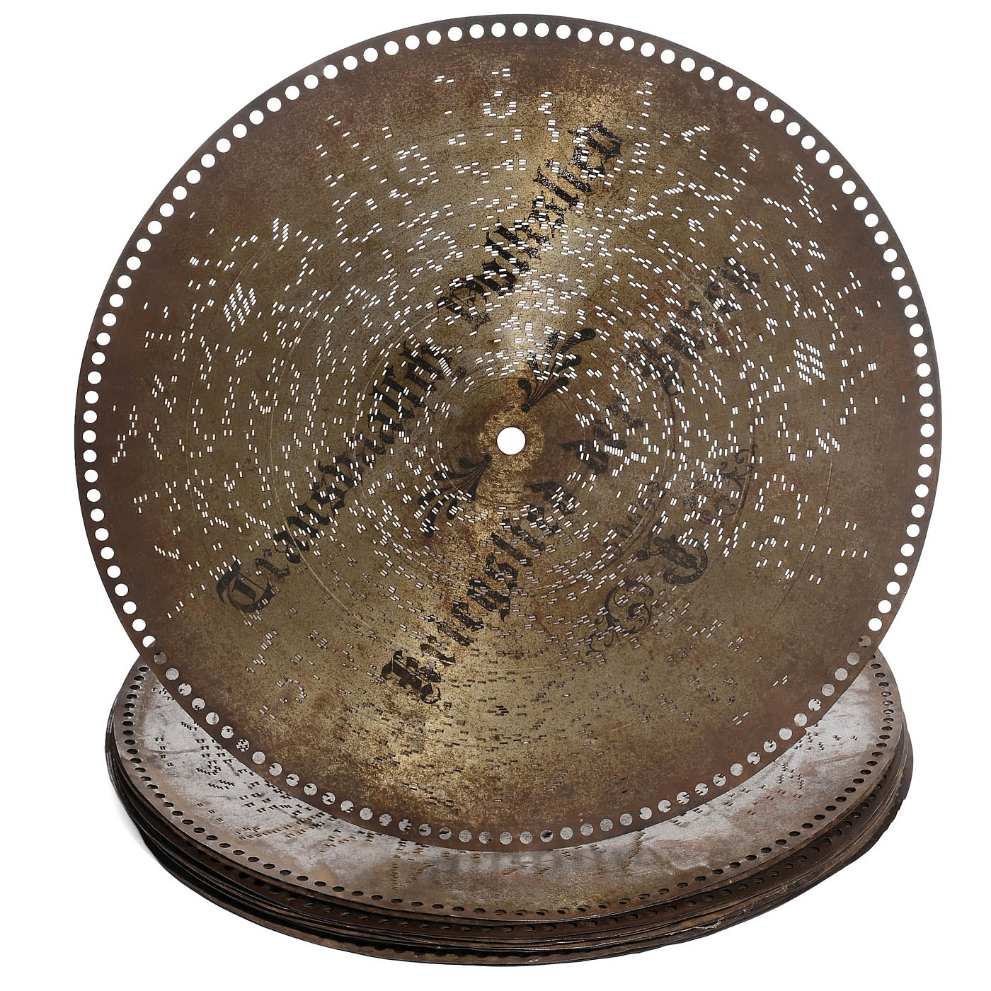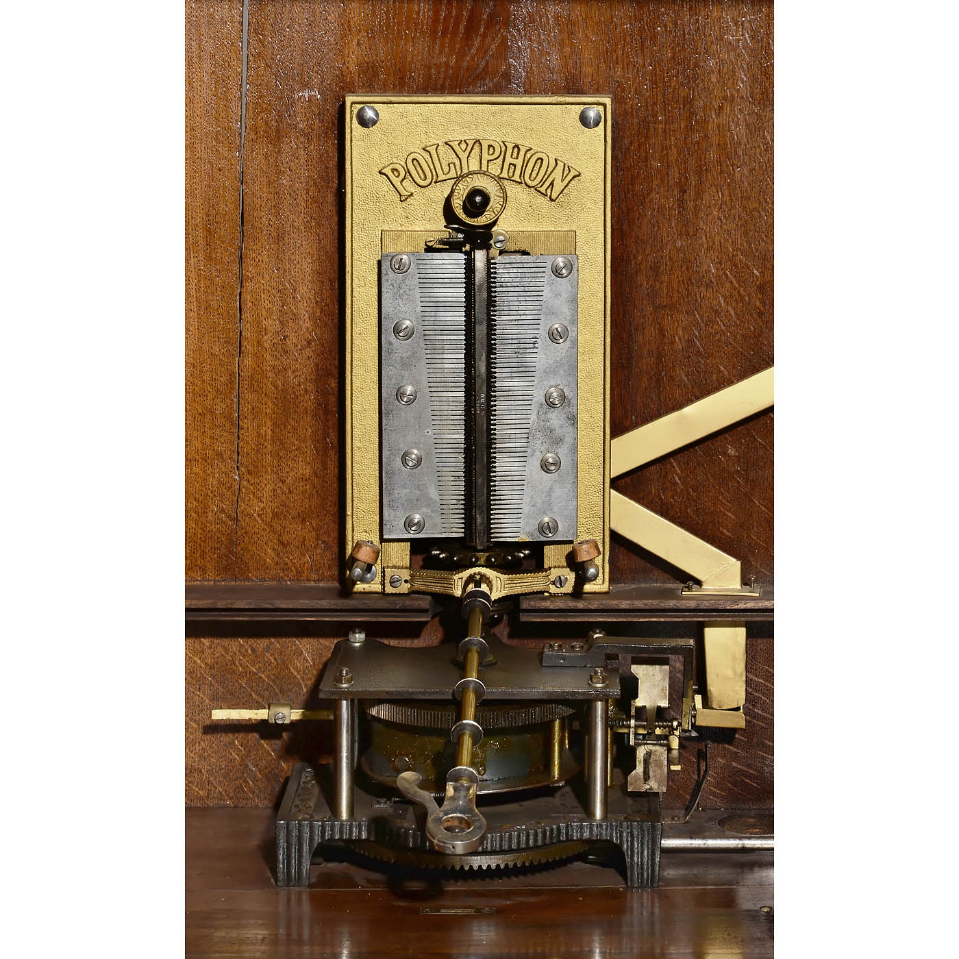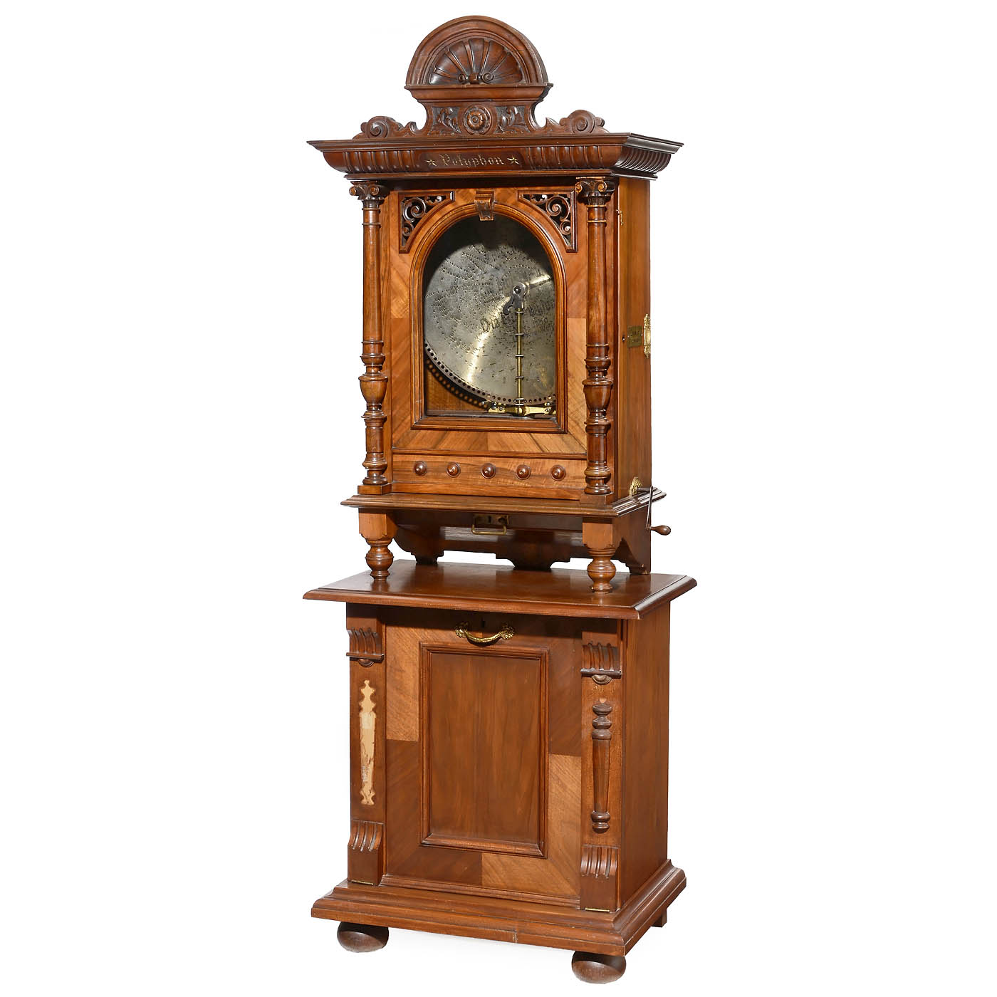 Polyphon Musikwerke, Leipzig. For 19 5/8-inch discs, coin slot, 118 teeth in duplex comb (complete), walnut case with drawer and pediment, with 14 discs, playing condition. Overall size with base cabinet: 28 ¾ x 17 ¾ x 77 in.