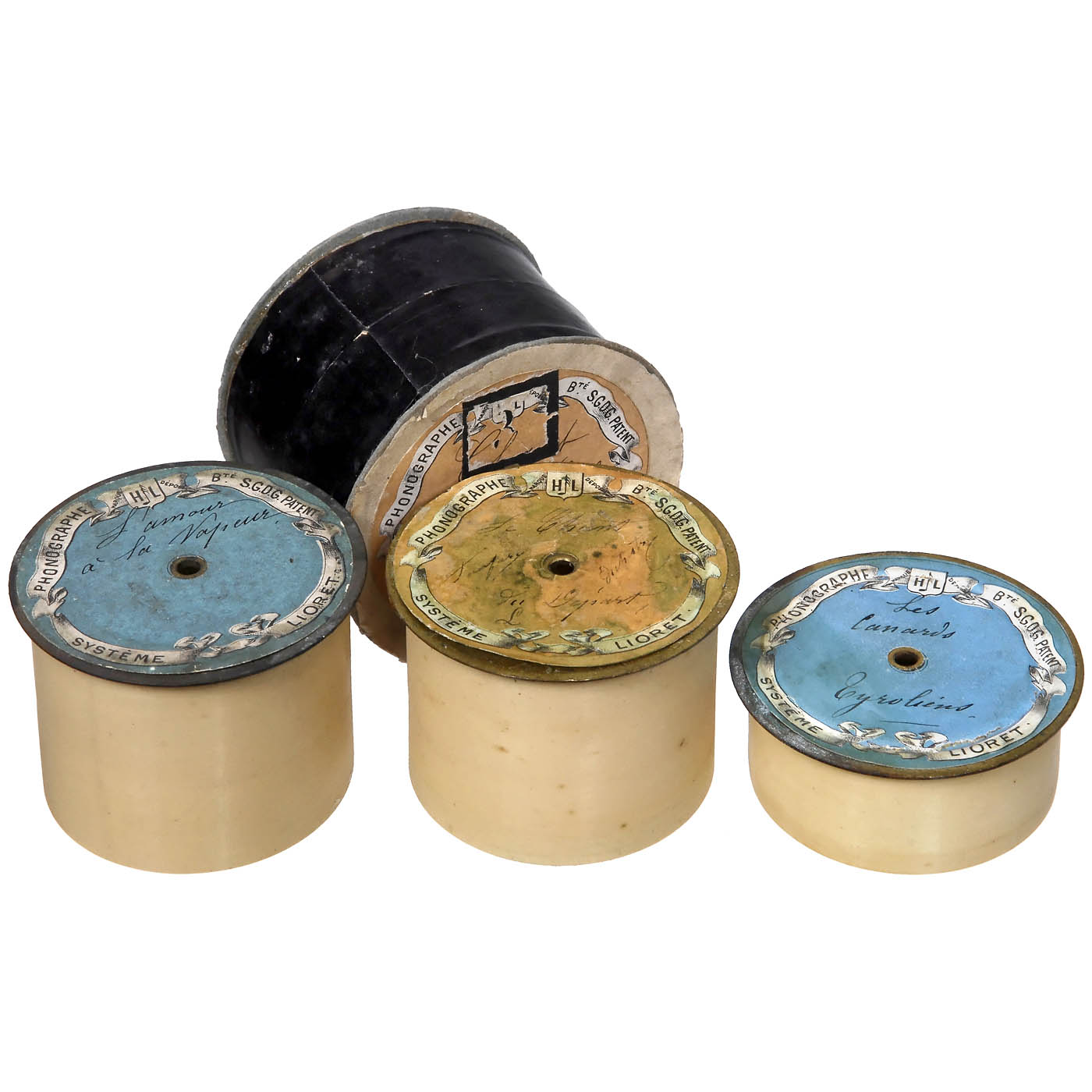 Rare French weight-driven phonograph for celluloid cylinders. Inventor and manufacturer was the Parisian clockmaker Henri Lioret (1848-1938). Nickel-plated brass case with stamp, serial no. 53172. Original reproducer and horn, on tripod. Including 3 Lioret celluloid cylinders and two transport boxes (period but not original). - Perfect original playing condition! - A milestone in phonograph history and an essential exhibit for any collection.