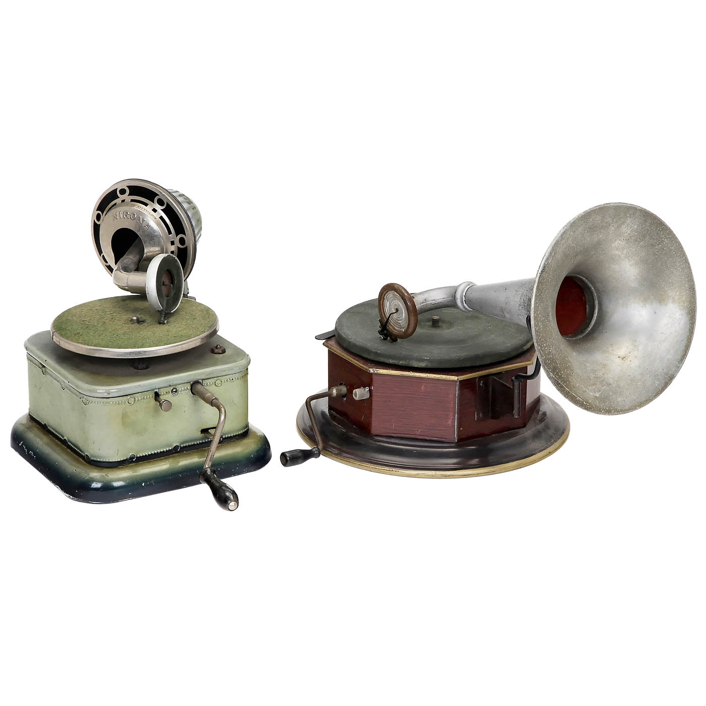 1) "Bingophone", Bing Werke, Nuremberg. Grained tin, spring-driven, working, 7-inch horn, with crank. - And: 2) "Nirona", miniature German gramophone by Nirona-Werke Nier & Ehmer, Beierfeld. Tin case, with typical reflex-tone horn, spring-driven, original condition, with crank, working.