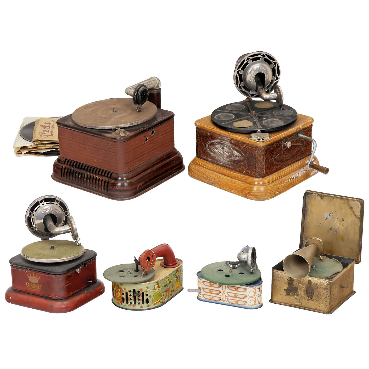 1) 2 unmarked toy gramophones, Germany. Lithographed tin, spring-driven, working, with keys. - 2) "The Fairy Melodious", England, maker unknown. Lithographed tin, hand-cranked, missing crank. - 3) "Nirona Coronet", German toy gramophone by Nirona-Werke Nier & Ehmer, Beierfeld. Tin case, with typical reflex-tone horn, spring-driven, defective, no crank. - 4) 2 table gramophones, tin cases, 1 crank, in need of restoration. - And: 5) 25 shellac discs.