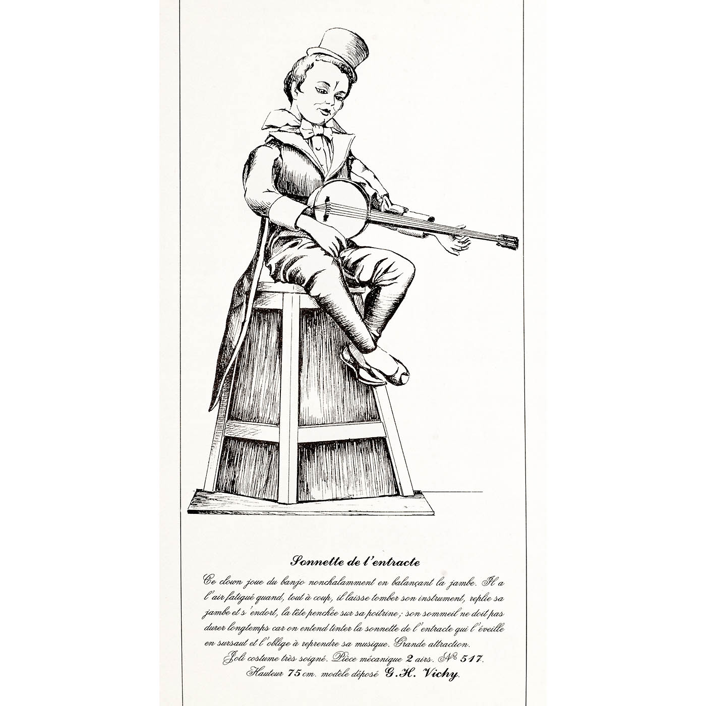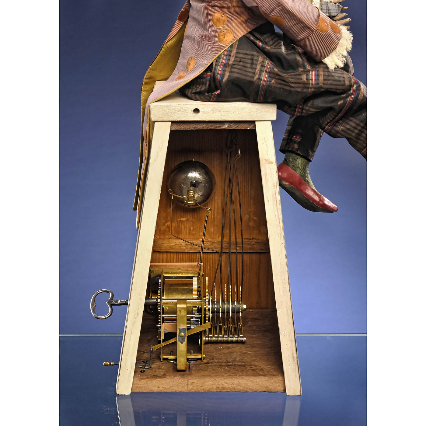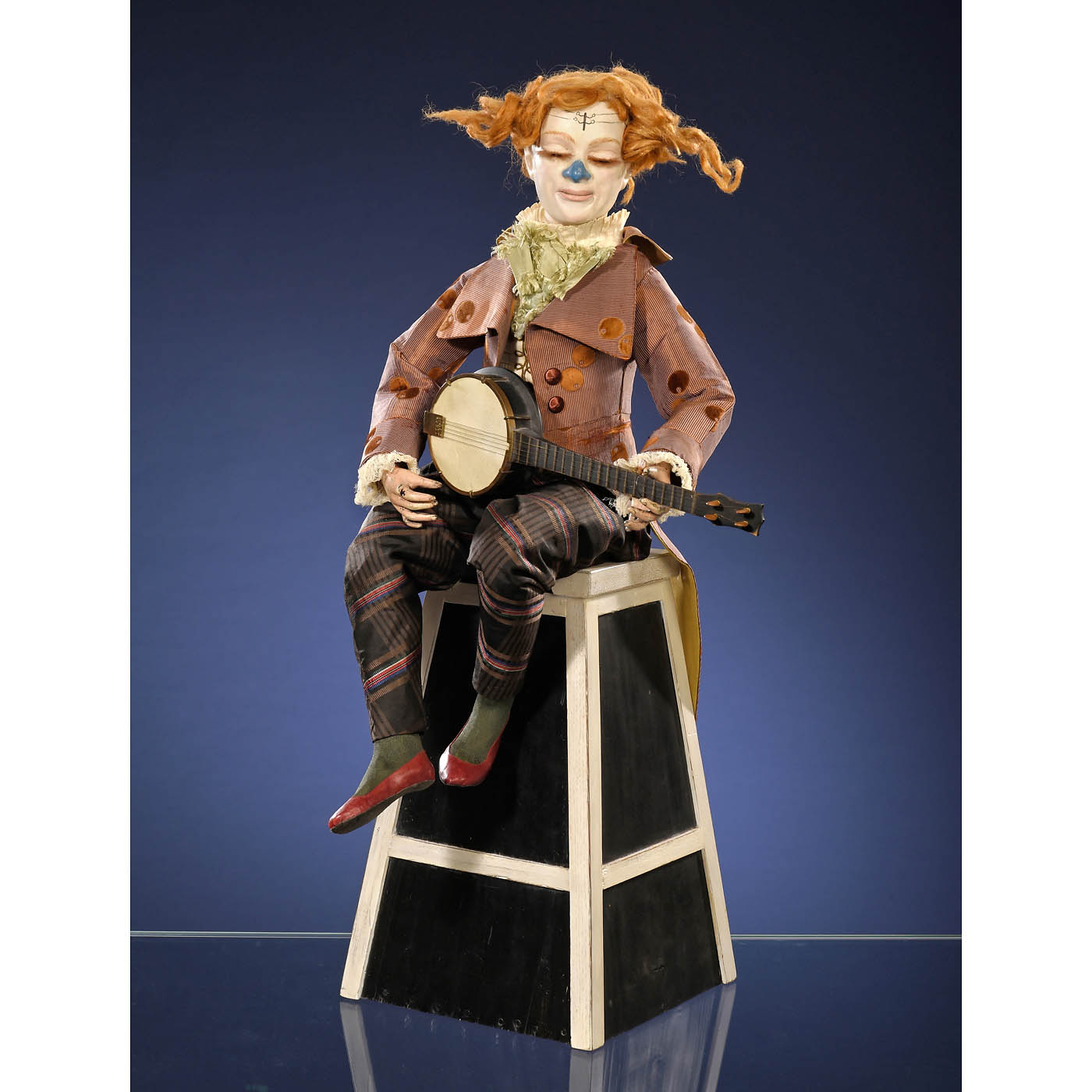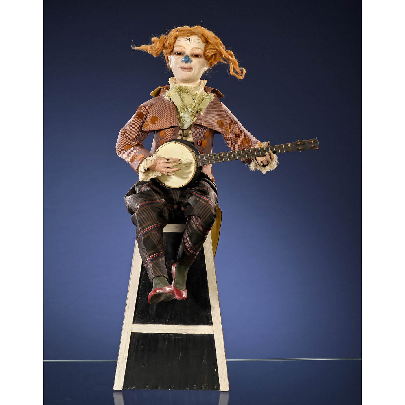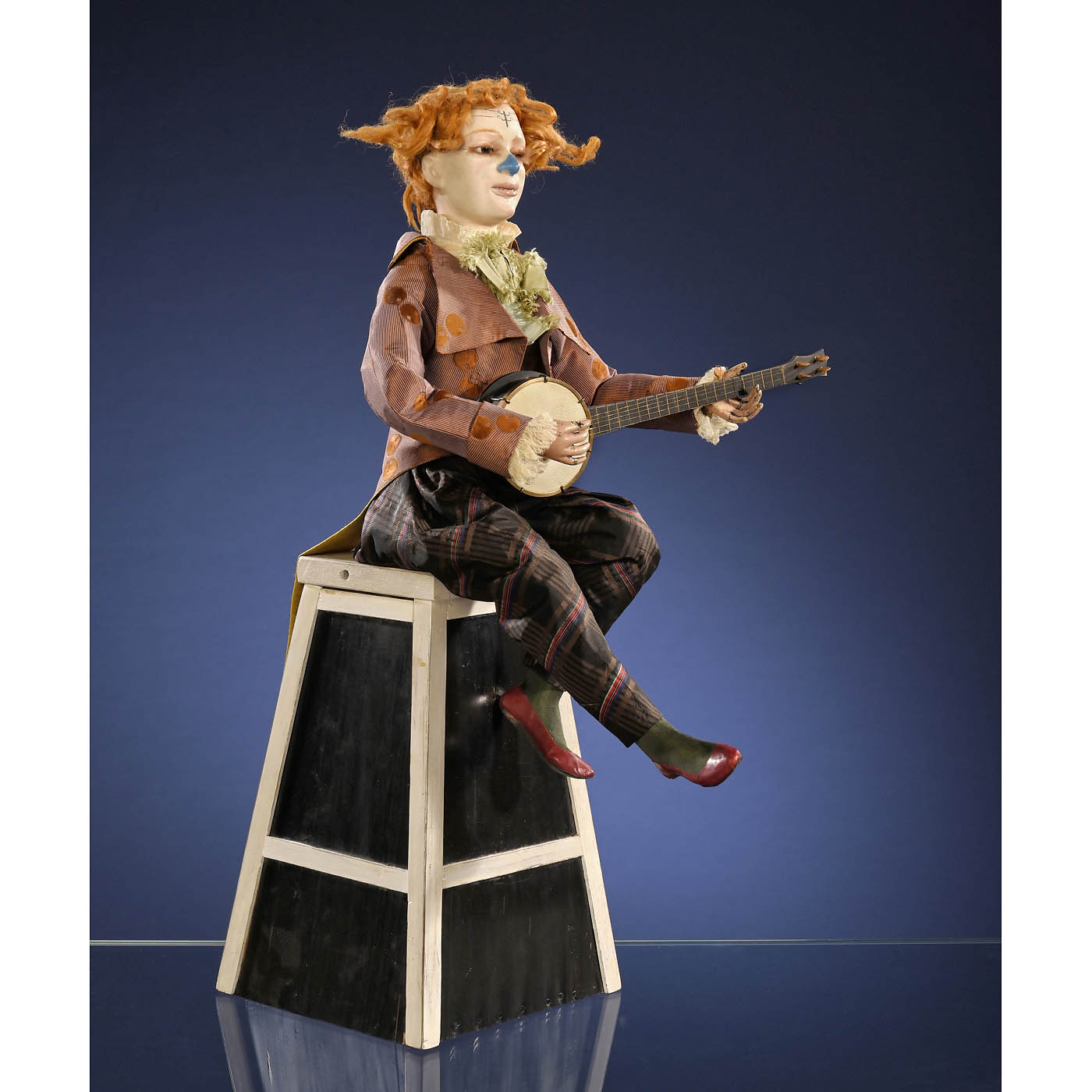 With plaster-composition head, blue-tipped nose, a telegraph motif decorating his forehead, red mohair wig, brown glass eyes, articulated eyelids and lower lip, seated on trapezoidal stool containing going-barrel motor with seven cams and intermittent two