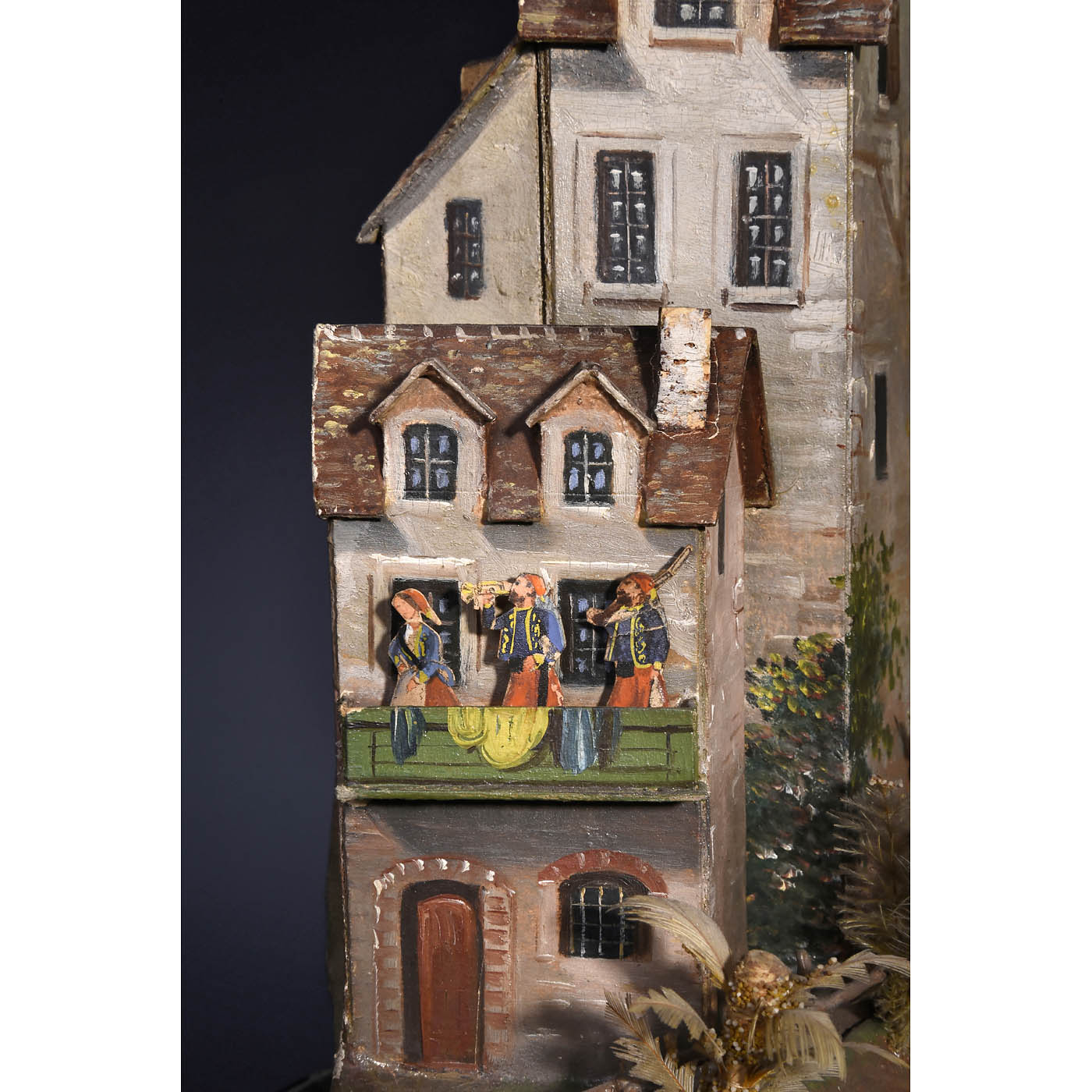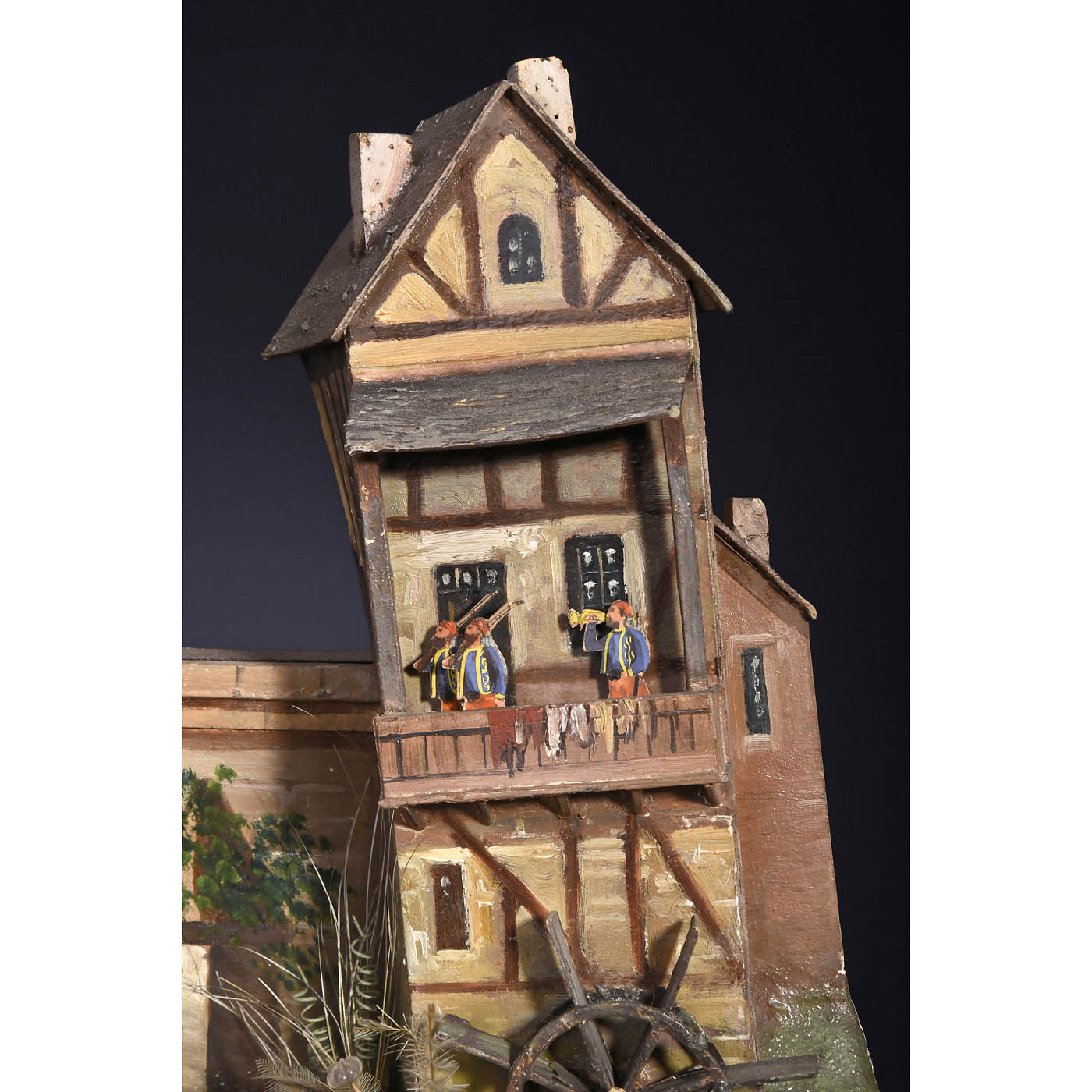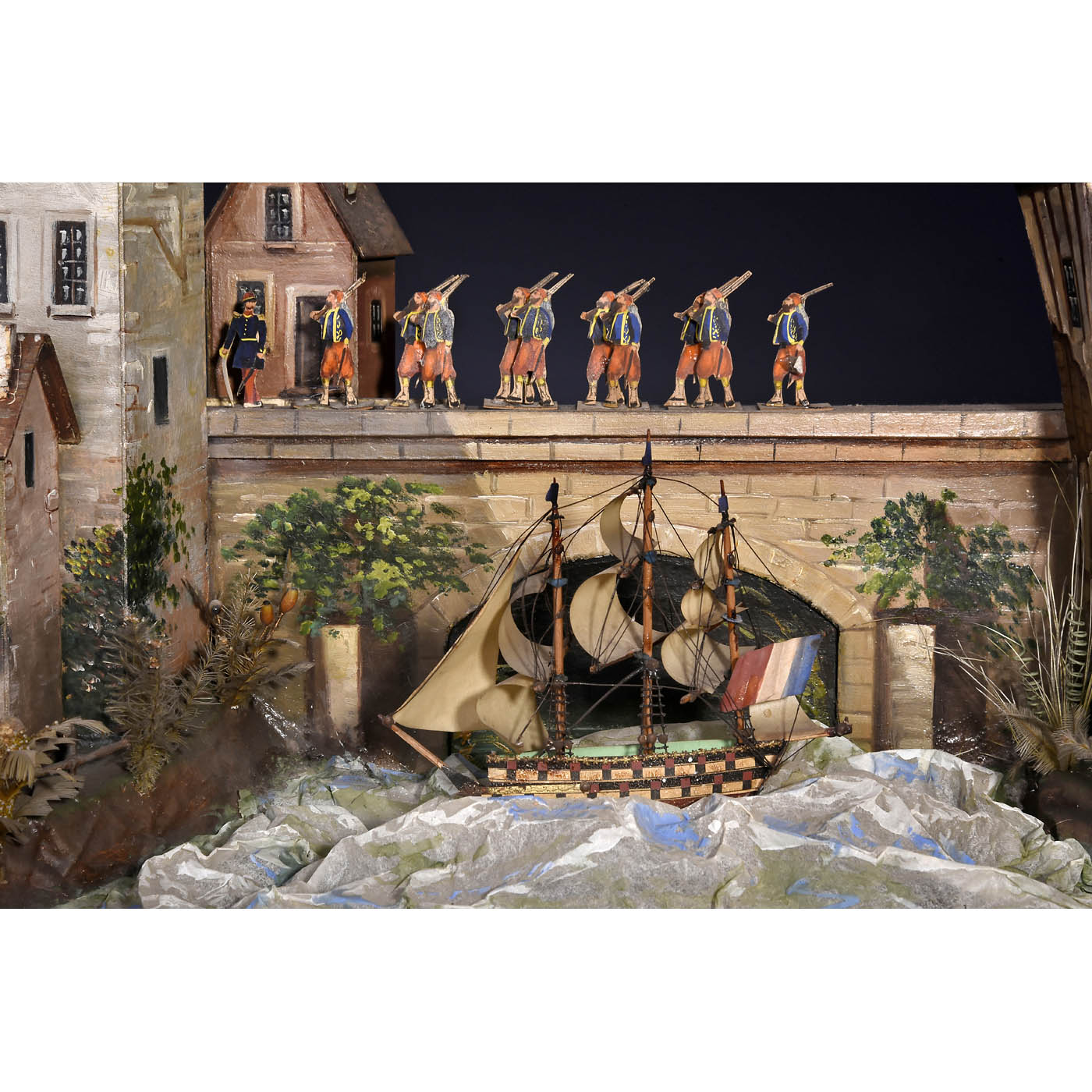 With painted card buildings, bridge, watermill and three-masted French ship, on ebonized base containing replacement two-air pull-string cylinder movement that causes the watermill to turn, the ship to heave on tissue-paper waves and a troop of soldiers to cross the bridge, under glass dome, ht. 19 ½ in. (50 cm) including the dome, good working condition.