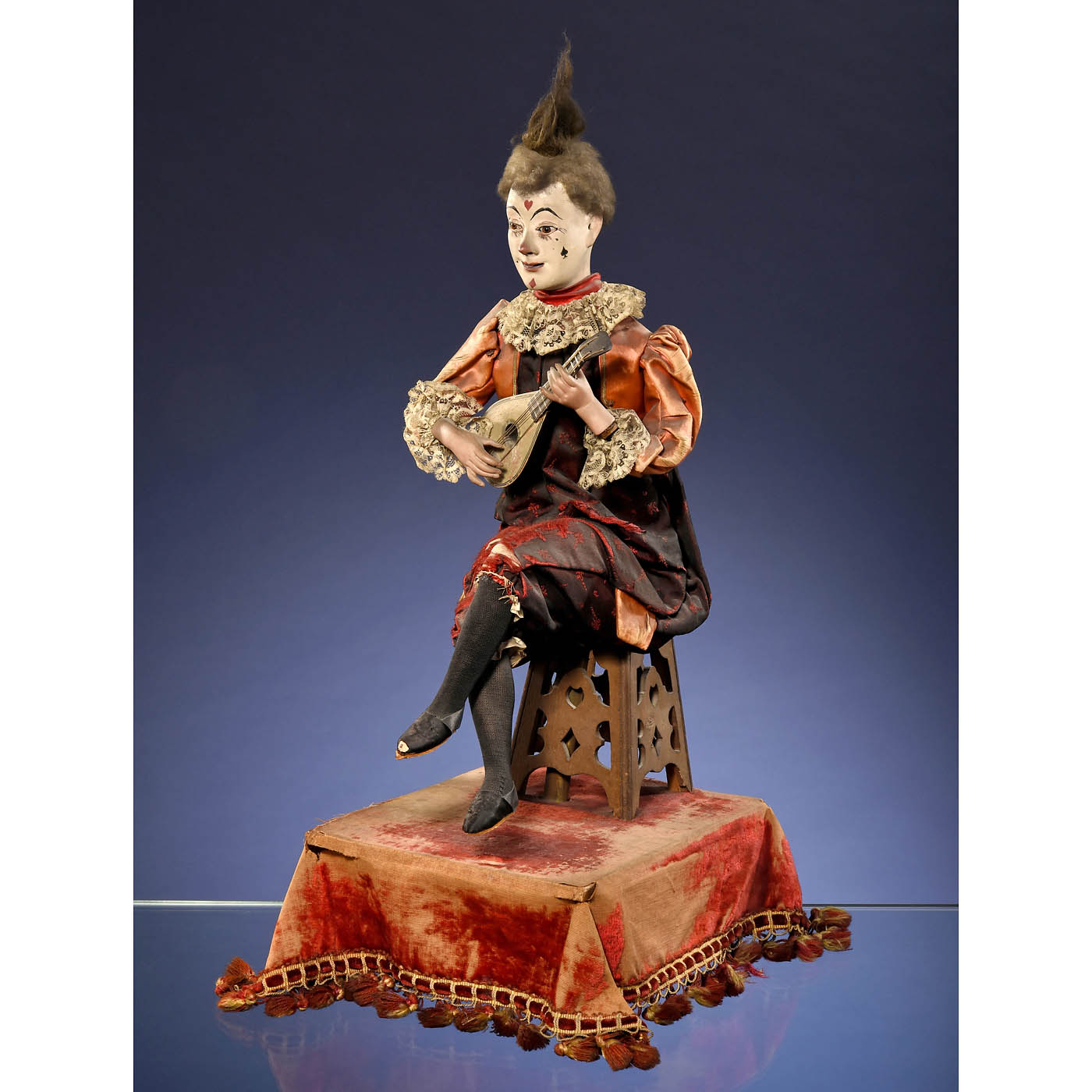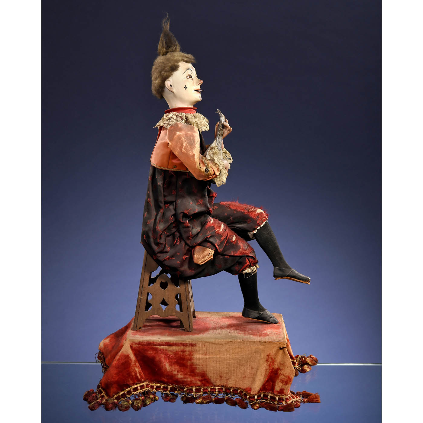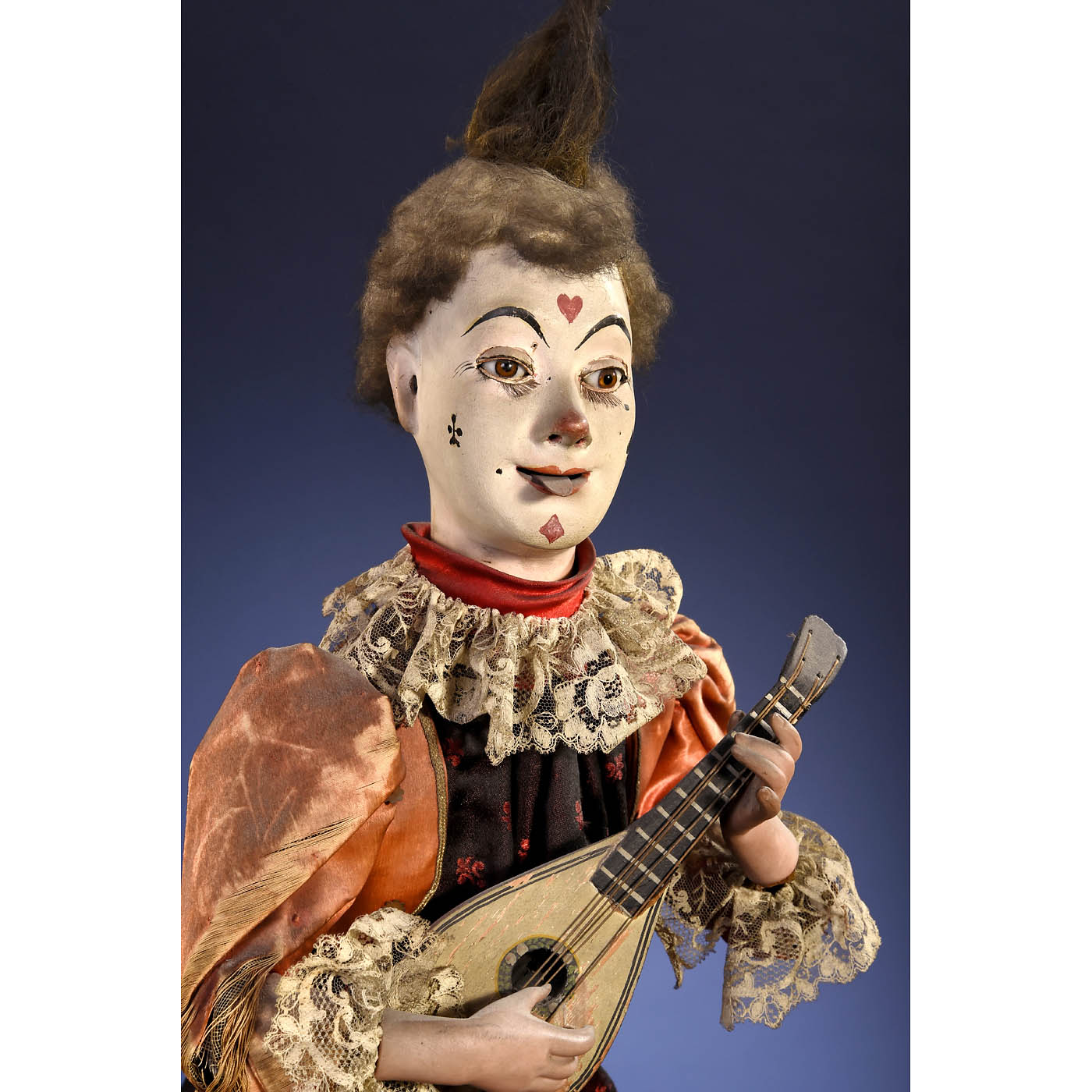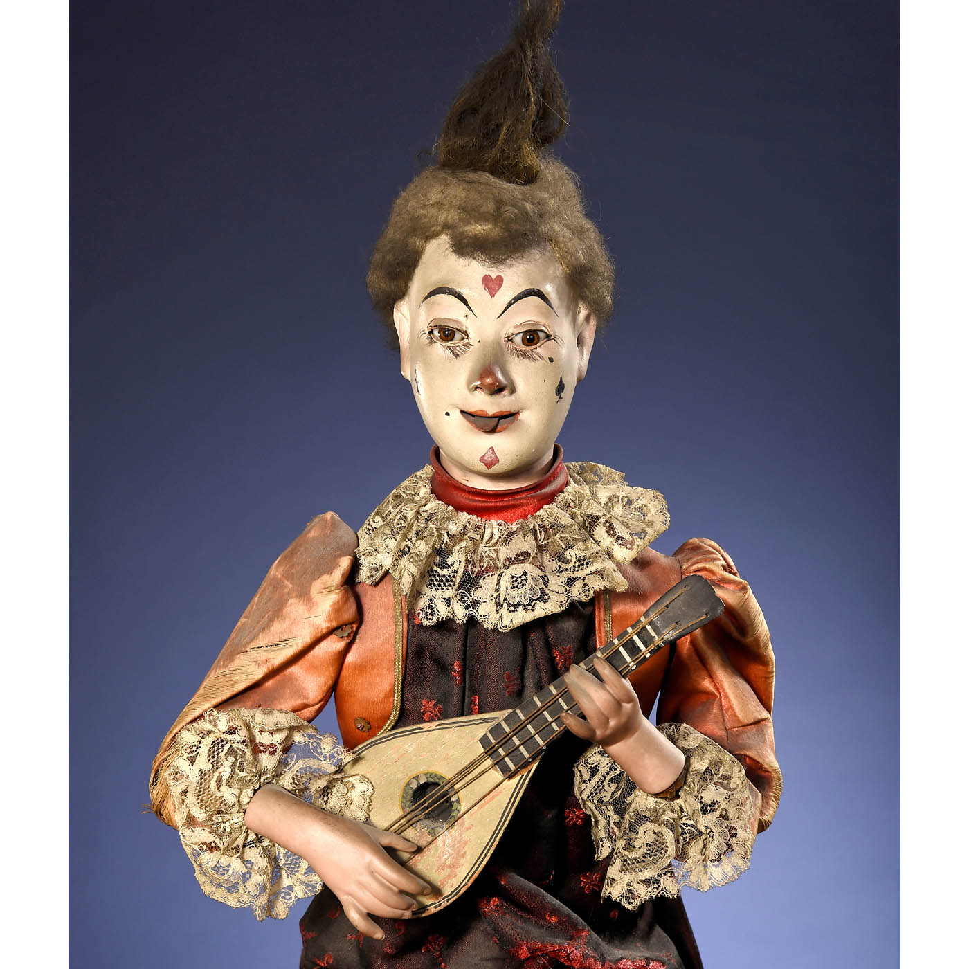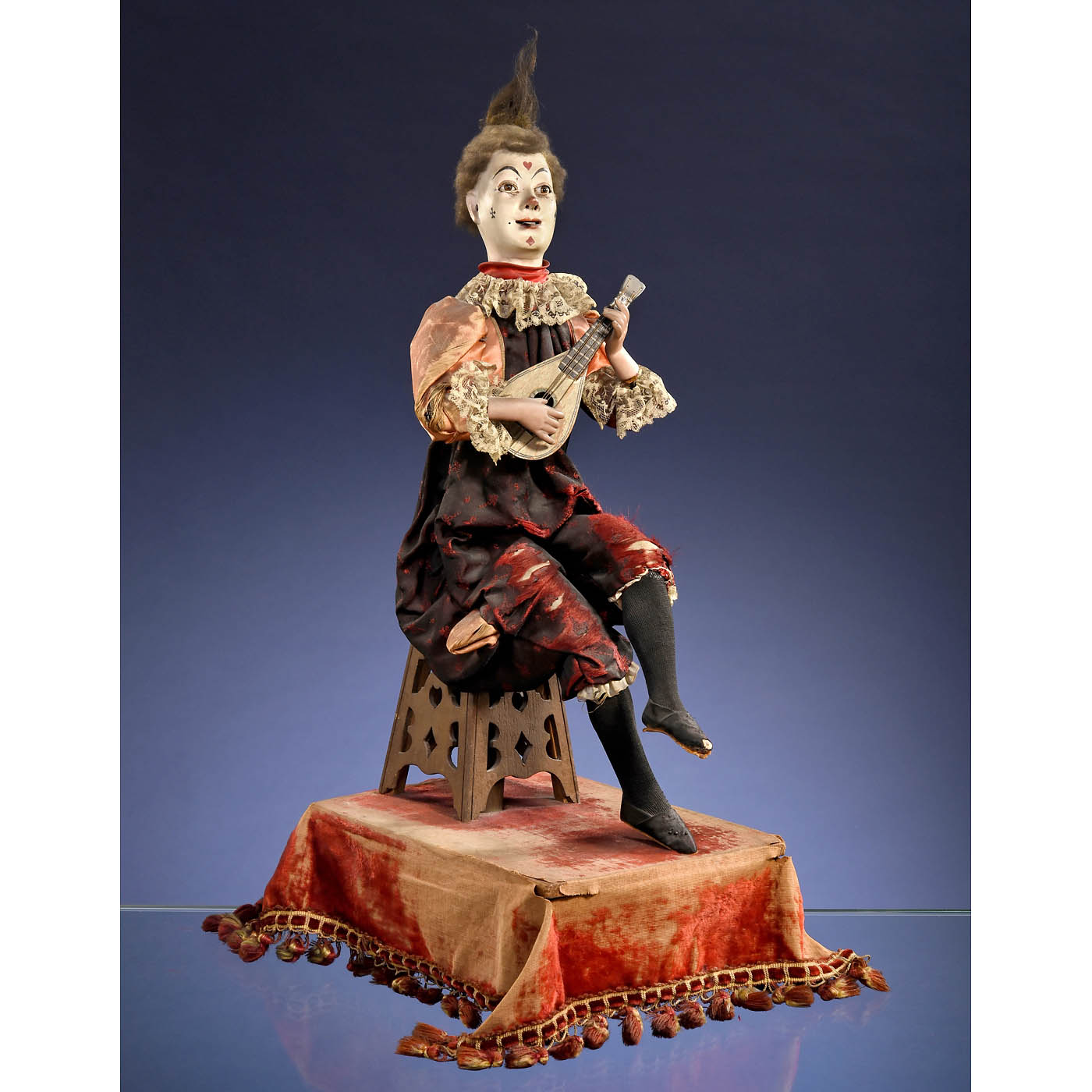 Depicting a clown musician sitting cross-legged on a fretwork stool, the figure with shapely bisque hands, papier-mâché head painted with heart, club, diamond and spade symbols, original paint, grey mohair wig, articulated eyelids and tongue, on velvet-co