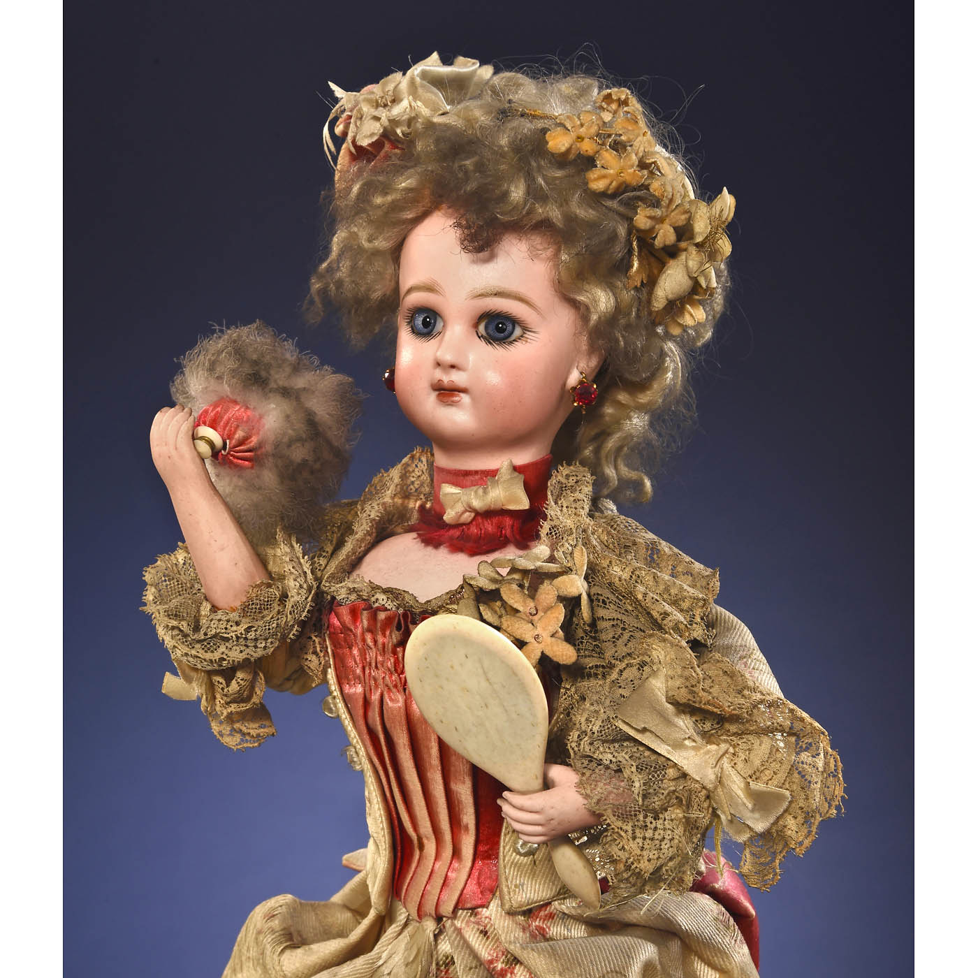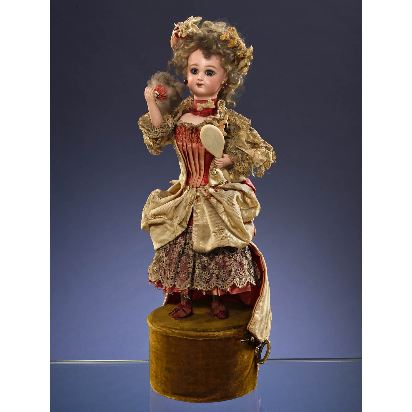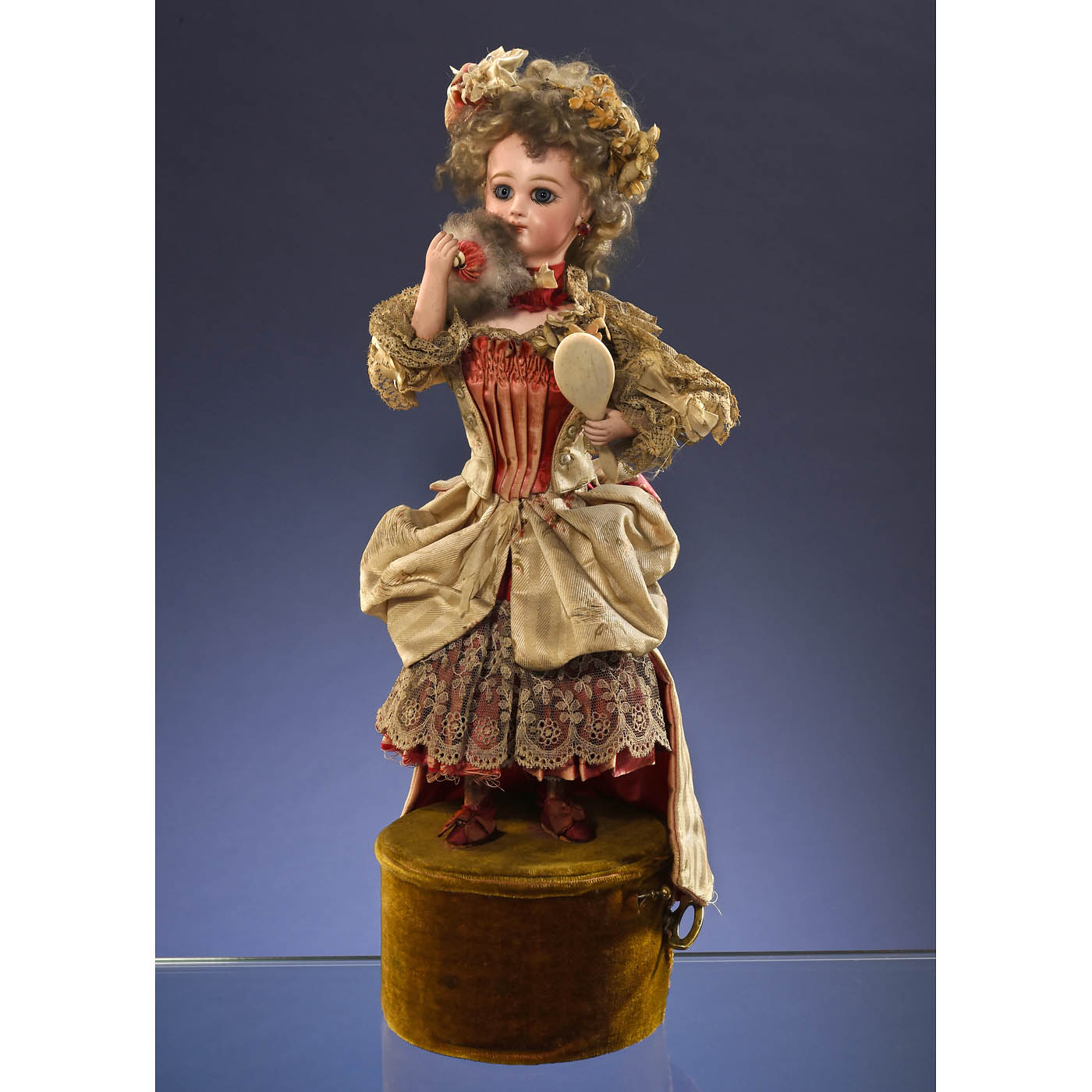 With unmarked Jumeau bisque head, closed mouth, fixed cornflower-blue threaded glass eyes, pierced ears with earrings, original dressed mohair wig in elaborate chignon (not removed for inspection), slender papier-mâché body with bisque shoulder plate and hands holding bone-handled mirror and a swansdown powder puff, on circular velvet-covered base containing three-cam going-barrel motor and cylinder movement playing two airs on one revolution as the lady turns and gently inclines her head, applies powder and raises her mirror to admire the result, dressed in original satin costume with lace-trimmed floral silk bodice and trained overskirt, ht. 18 in. (46 cm), left arm inactive, otherwise good unrestored working and playing condition. With factory brass key and tune-sheet marked "Jouet d'Enfant, H.M." - A well-preserved automaton from the first years of the firm's production, with refined couturier costume from the atelier of Eugénie Bourgeois Lambert.