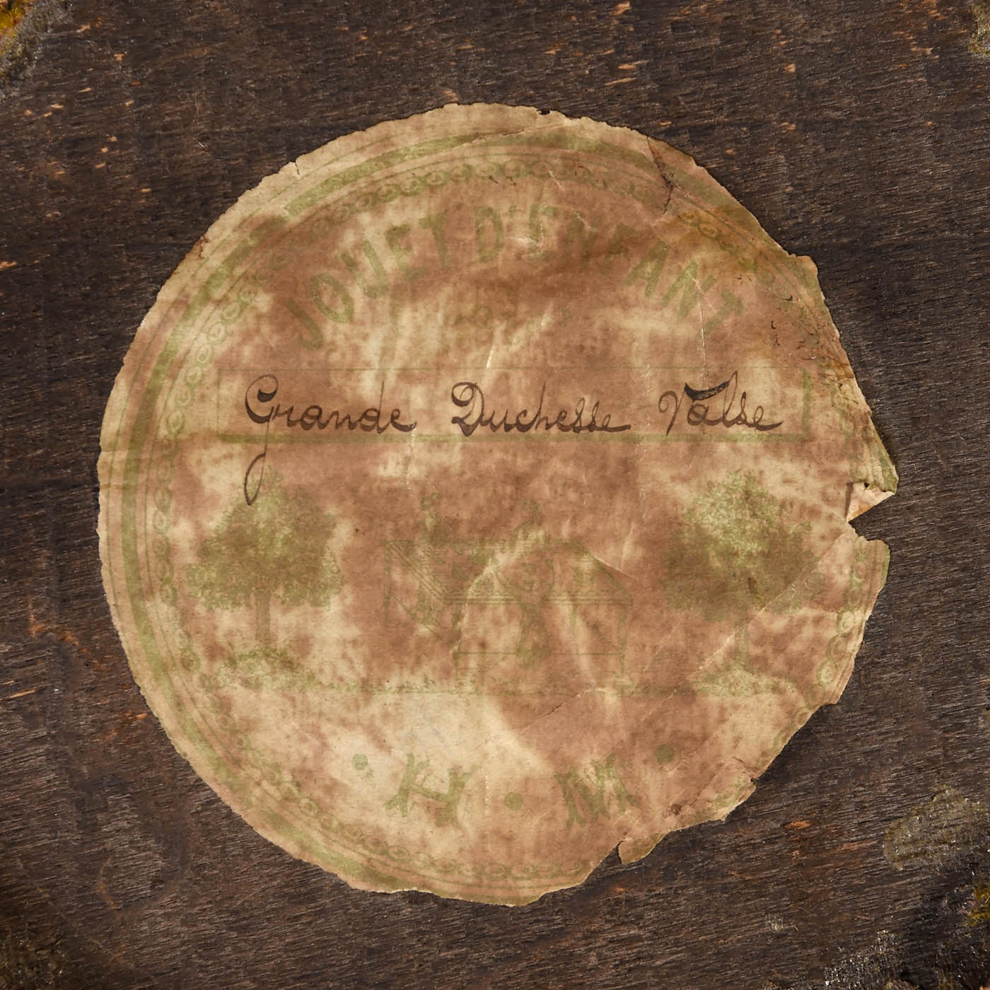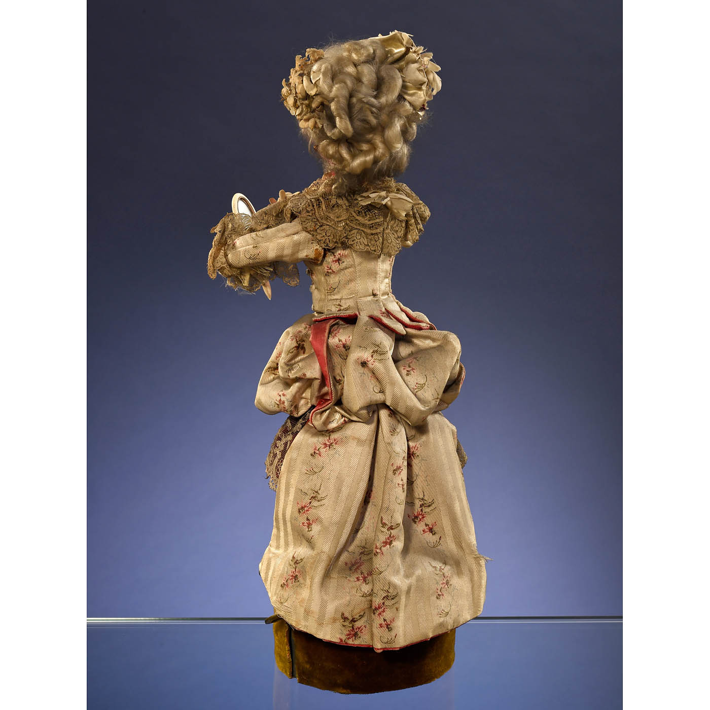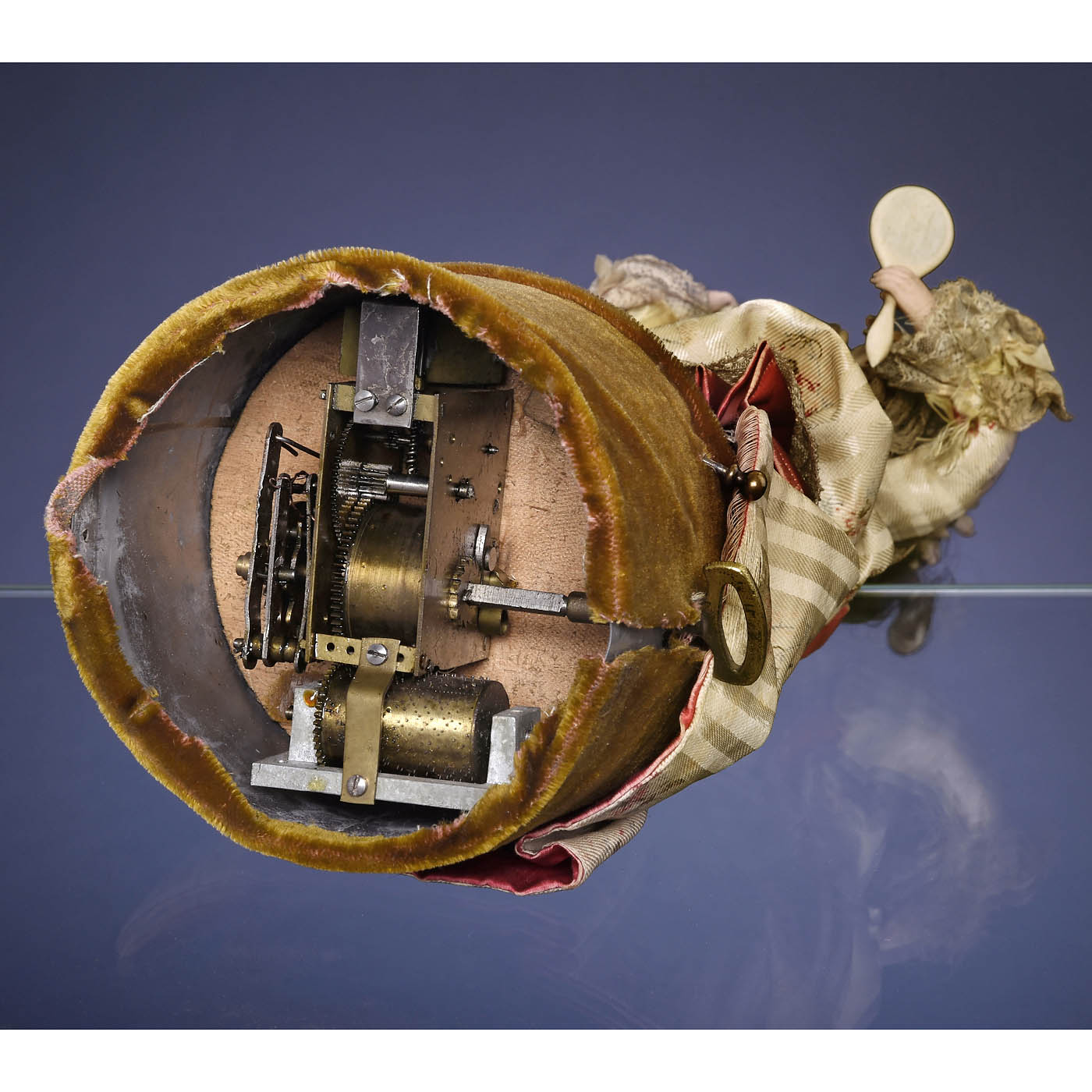 With unmarked Jumeau bisque head, closed mouth, fixed cornflower-blue threaded glass eyes, pierced ears with earrings, original dressed mohair wig in elaborate chignon (not removed for inspection), slender papier-mâché body with bisque shoulder plate and hands holding bone-handled mirror and a swansdown powder puff, on circular velvet-covered base containing three-cam going-barrel motor and cylinder movement playing two airs on one revolution as the lady turns and gently inclines her head, applies powder and raises her mirror to admire the result, dressed in original satin costume with lace-trimmed floral silk bodice and trained overskirt, ht. 18 in. (46 cm), left arm inactive, otherwise good unrestored working and playing condition. With factory brass key and tune-sheet marked "Jouet d'Enfant, H.M." - A well-preserved automaton from the first years of the firm's production, with refined couturier costume from the atelier of Eugénie Bourgeois Lambert.
