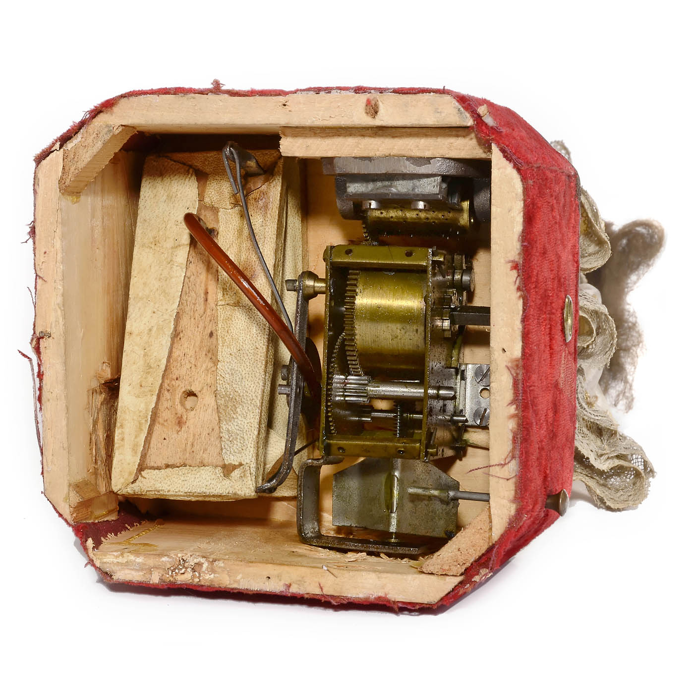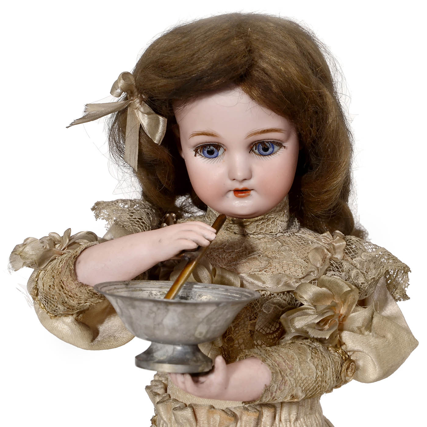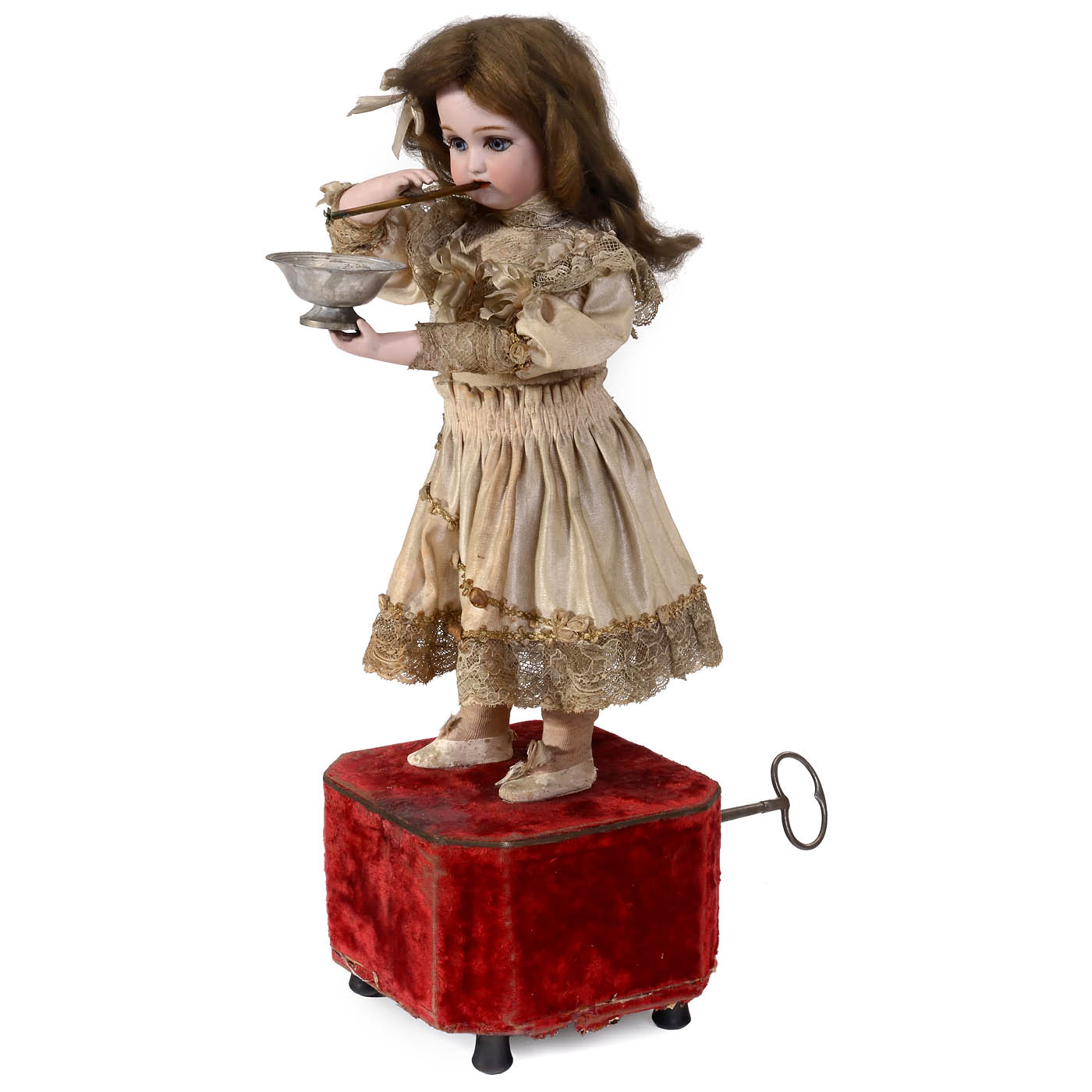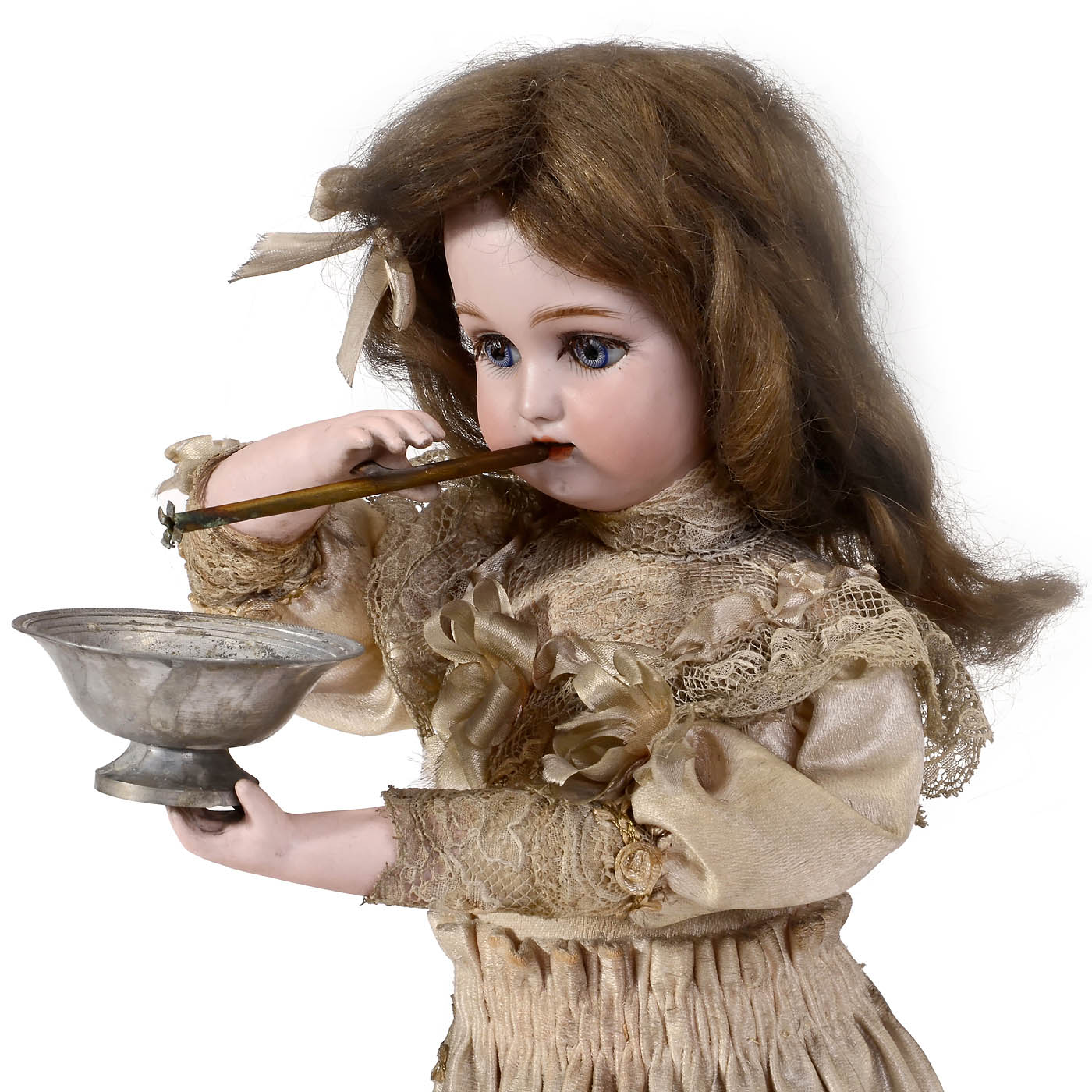 With Simon & Halbig bisque head incised "Germany, 4 ½". Open mouth, fixed threaded blue glass eyes, pierced ears, original full brown mohair wig (not removed for inspection), bisque hands holding a pewter bowl and a hollow brass wand, dressed in original cream satin costume trimmed with lace, ribbons and metallic floral braid, velvet-covered base containing going-barrel motor, bellows and single-air cylinder musical movement, ht. 18 in. (46 cm), working condition, head movement inactive, not tested with soapy water. With size 10 steel key. - The girl dips her wand into a soapy solution, lifts it to her lips, raises her head and blows bubbles via the bellows in the base. - A scarce and ingenious Roullet et Decamps automaton, with pretty bisque head and attractive original presentation. - Provenance: Collection of José Mario Armero.