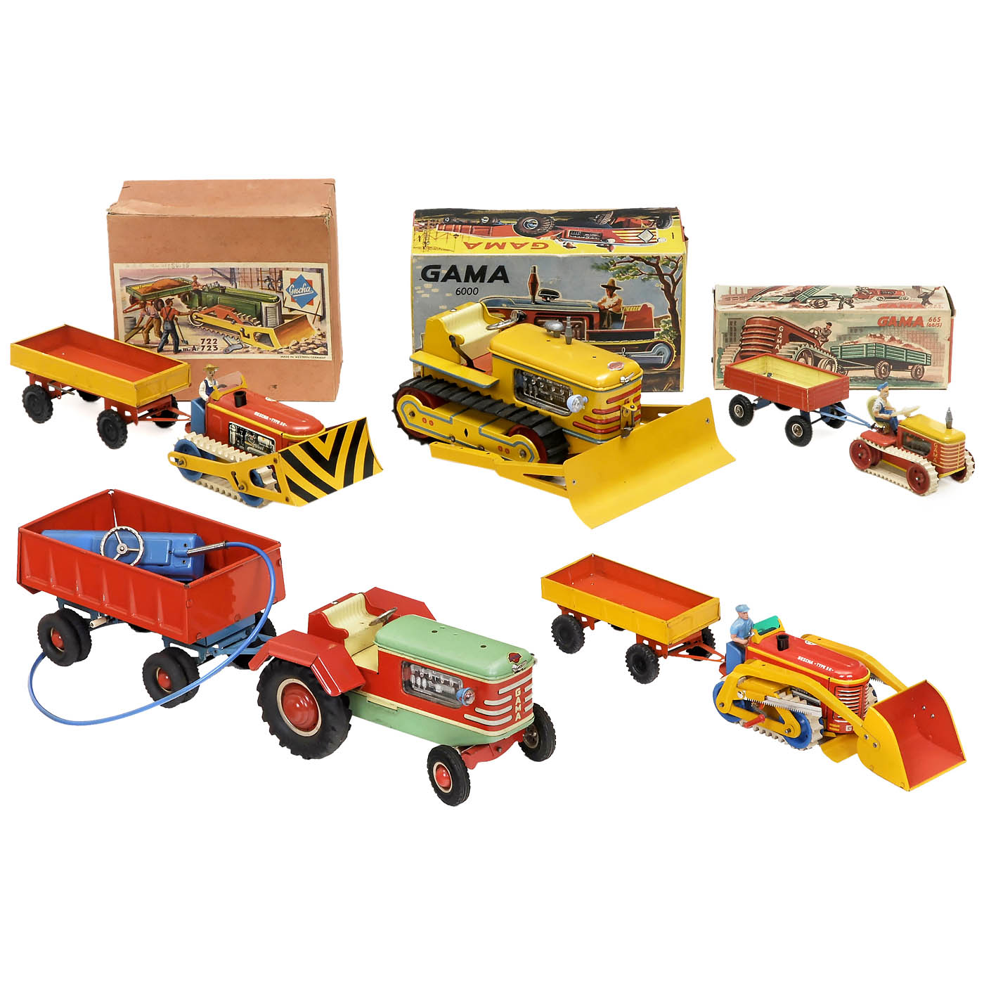 Lithographed tin 1) Gama no. 665, spring-driven (working, chain slips), length with trailer 8 ¾ in., with key, original box. - 2) Gama no. 6000, electric (untested), with shovel, length 9 in., original box. - 3) Gescha no. 723, spring-driven (working, chain slips), with shovel and trailer, length 13 1/3 in., with key, original box. - 4) Gescha no. 723, spring-driven (working, chain slips), with shovel and trailer, length 15 in. - And: 5) Gama tractor with dump trailer, battery-powered, battery compartment dirty, no driver's figure and chimney, otherwise in good condition, length 19 in.