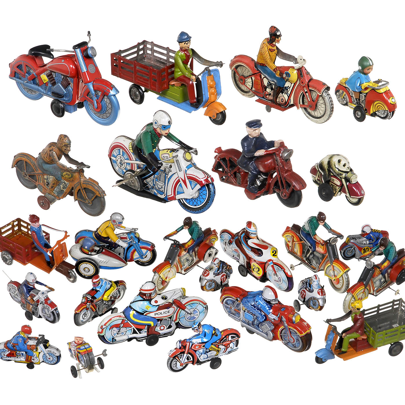 1) J.M.L., France, lithographed tin, spring-driven (working), 1 arm loose, length 8 ¼ in. - 2) Modern Toys, Japan, lithographed tin, battery (untested), missing parts, length 11 ¾ in. - 3) Motorbike with sidecar, China, lithographed tin, spring-driven (working), length 7 in. - 4) 3 x Juguetes Roman, Spain, lithographed tin, friction (working), lengths 6 and 9 in. - 5) 4 cargo scooters, unmarked, hand-painted tin, manufactured without drive, length 8 ¼ in. each. - 6) 3 large motorcycles, unmarked, lithographed tin, spring-driven (working), length 8 ¾ in. each. - 7) Panda on motorcycle, China, length 3 ½ in. - 8) Police motorcycle, unmarked, cast metal, length 6 in. - And: 9) 15 other models, China and Japan, each lithographed tin. - Not everything illustrated.
