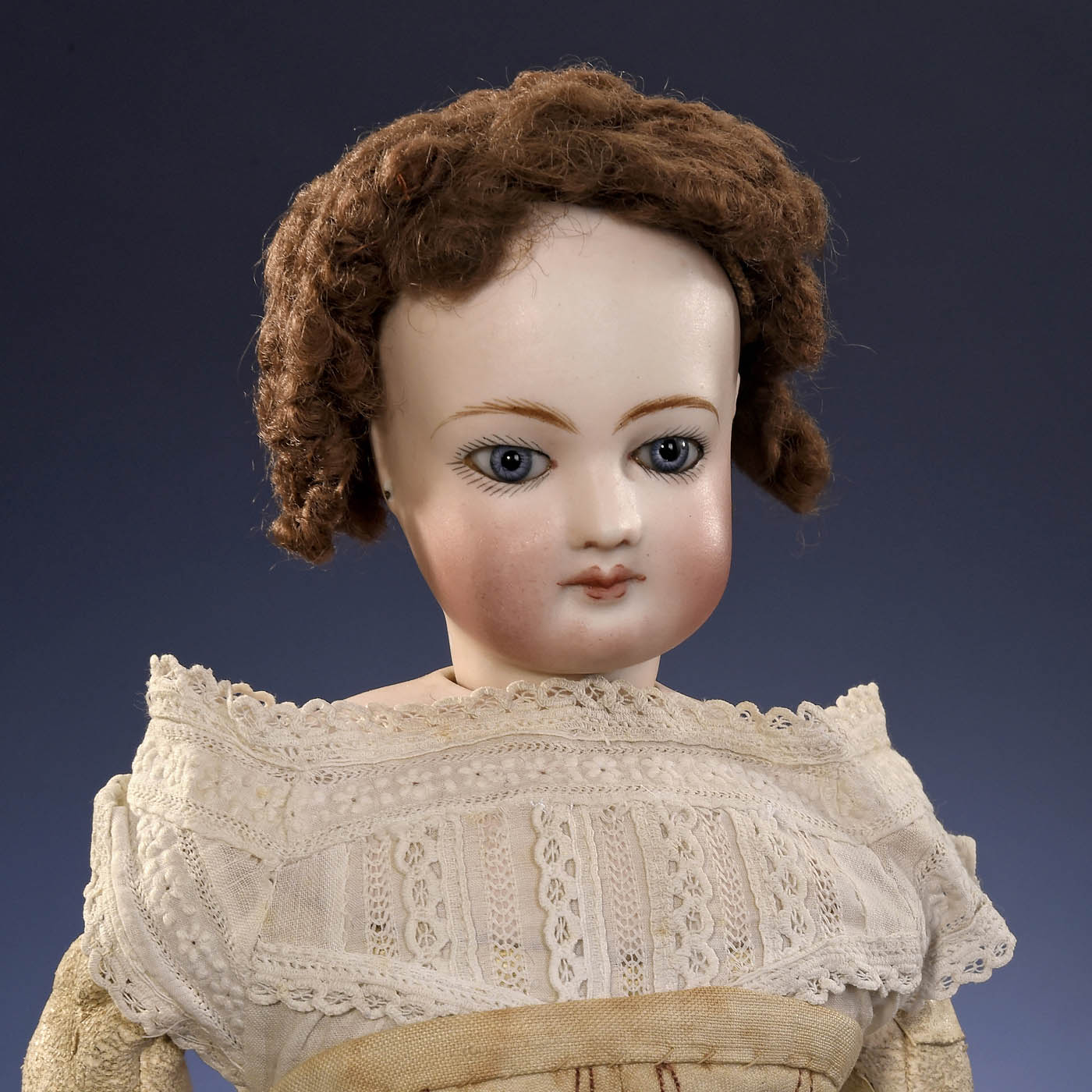 Probably by Jumeau. With pressed bisque swivel-head on shoulderplate, closed mouth, fixed threaded blue glass eyes, arched and feathered brows, pierced-in ears (chip on right earlobe), cork pate, curly brown mohair wig, gusseted kid body with straight legs, original lawn chemise and corset, ht. approx. 16 in. (41 cm), head has been light-tested and appears to be free of cracks and repairs, small white scuff on nape of neck, a few small patches on the body, otherwise good overall condition.