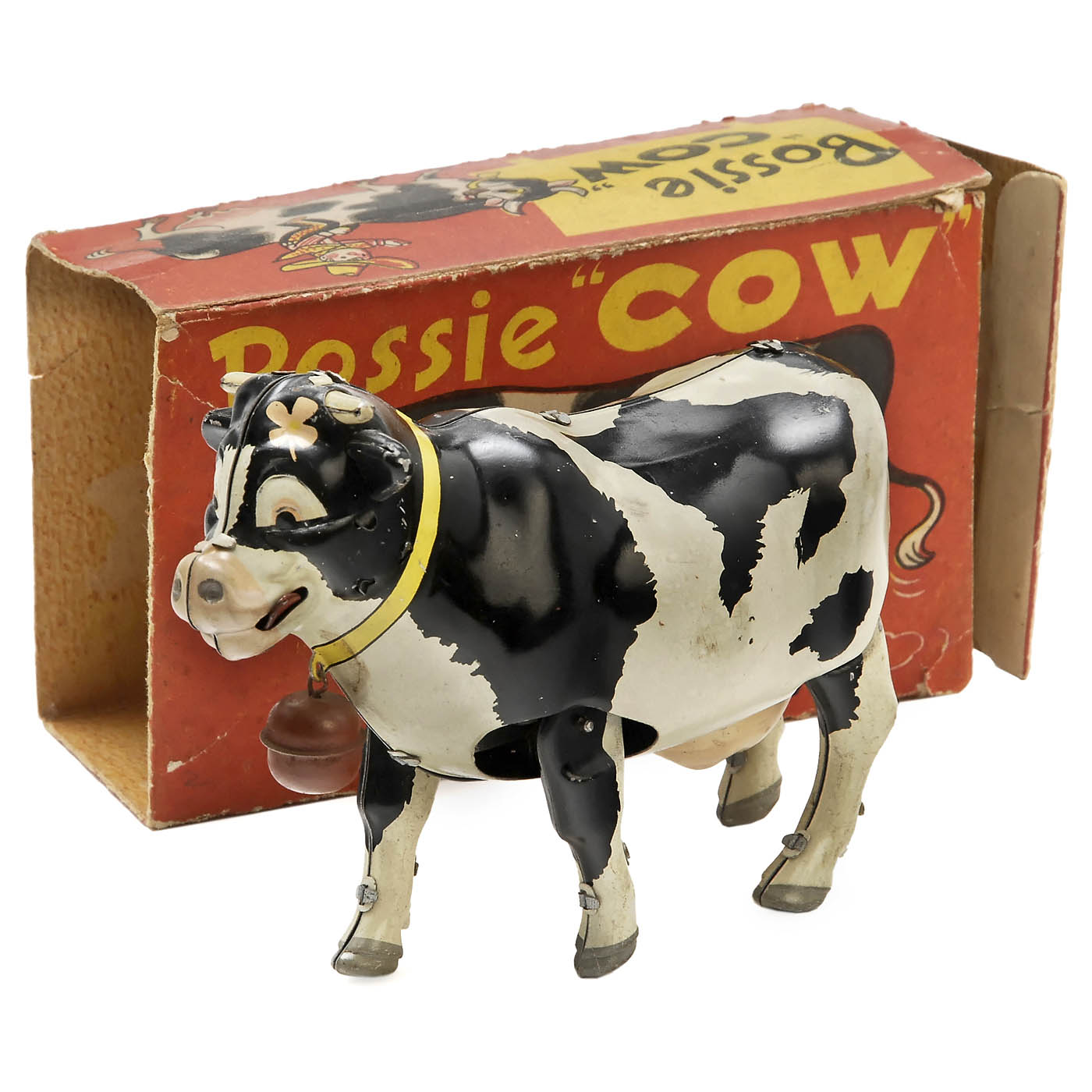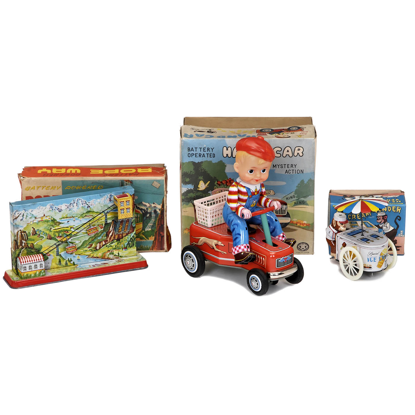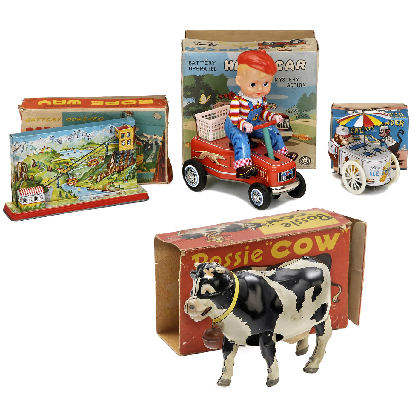 1) Bossie "Cow" toy by Alps, c. 1955. Patent no. 373980, lithographed tin, spring-driven (working). The cow trots forwards, wiggles her tail and sticks out her tongue. Length 6 in., with original card box (damaged), extremely rare. (2/2) - 2) "Rope Way", Modern Toys, lithographed tin, battery-powered (defective), width 9 ½ in., with original card box. (3/4) - 3) "Hand Car", Modern Toys, lithographed tin and plastic, battery-powered (working), length 7 4/5 in., with original card box. (2/2) - And: 4) "Ice Cream Vendor" by Yone, lithographed tin, spring-driven (working), with original card box. (2/2)