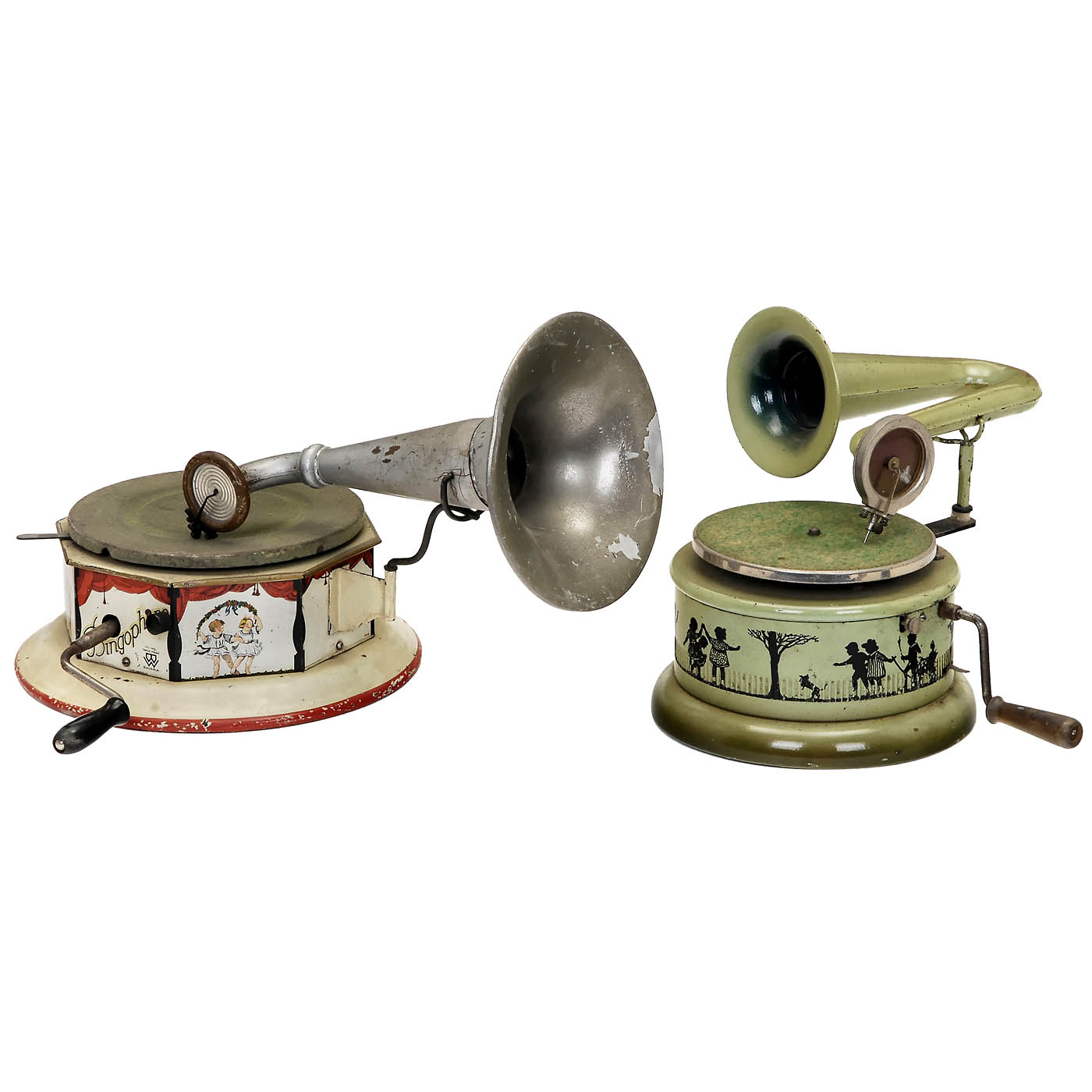 1) "Bingophone", Bing Werke, Nuremberg. Lithographed tin case, spring-driven, working, 7-inch horn, reproducer replaced, with crank. - And: 2) "Nirona" miniature horn gramophone, by Nirona-Werke Nier & Ehmer, Beierfeld, Germany. Tin case, with rare metal horn, spring-driven, working, with crank.