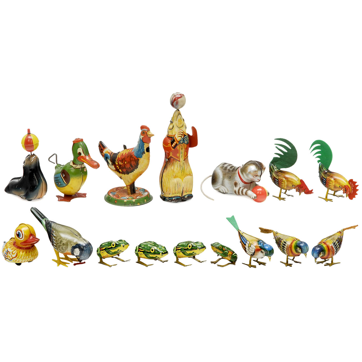 Germany. Lithographed tinplate, mostly spring-driven, all working. 1) Höfler, juggling bear. - 2) Gama, nodding duck. - 3) Lehmann, sealion, cat and duck. - 4) Maker unknown, chicken laying eggs. - And: 5) Köhler, 4 frogs and 6 birds, one with chirp. - With one Gama key.