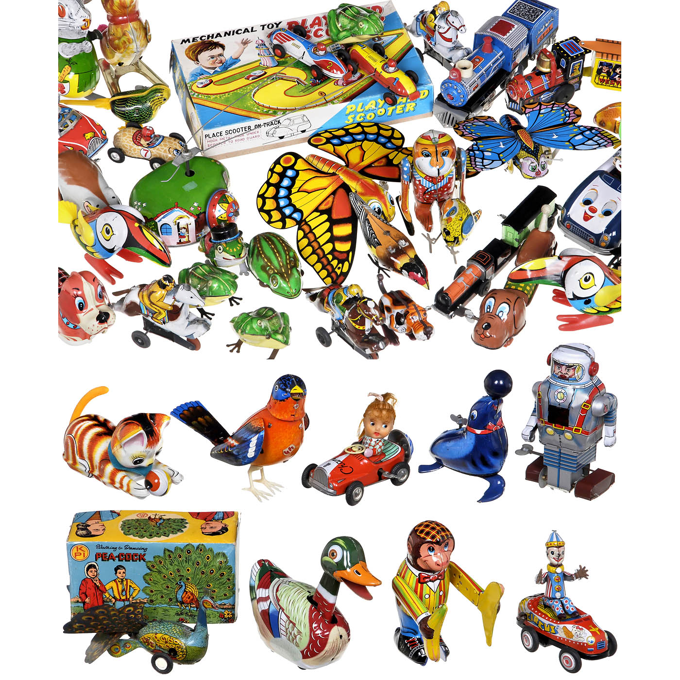 Mostly spring-driven, lithographed tin, some with plastic parts. Birds, butterflies, mice, frogs, cars, locomotives, toy train, robots and others. Manufacturers include: Yone, Mikuni, T.P.S., Noguchi, Hashimoto and others. All parts in good condition, drives not tested. - In addition: Mechanical peacock, probably India, in box.