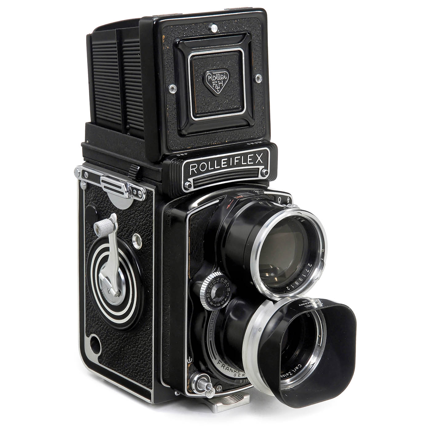 Franke & Heidecke, Braunschweig. No. S 2303234, first version with flat glass! Sonnar 4/135 mm, no. 2718457. With lens hood, Rolleinar 2, cap and leather case. A very good fully working camera for the user!