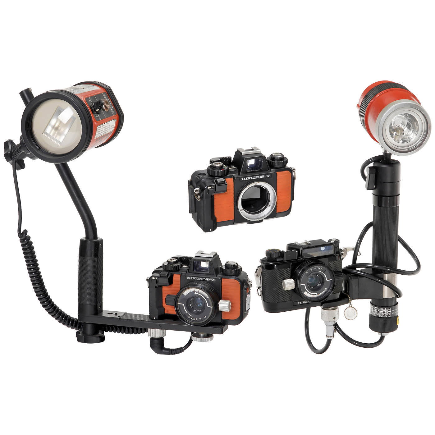 Nikon, Japan. 1) Nikonos III with Nikkor 2,5/35 mm. - 2) Nikonos-V with Nikkor 2,5/35 mm. - 3) Nikonos-V body. - 4) Nikonos SB103 flash. - And: 5) Sunpak Marine 28 flash. - All cameras, accessories and lenses untested. Good cosmetic condition.