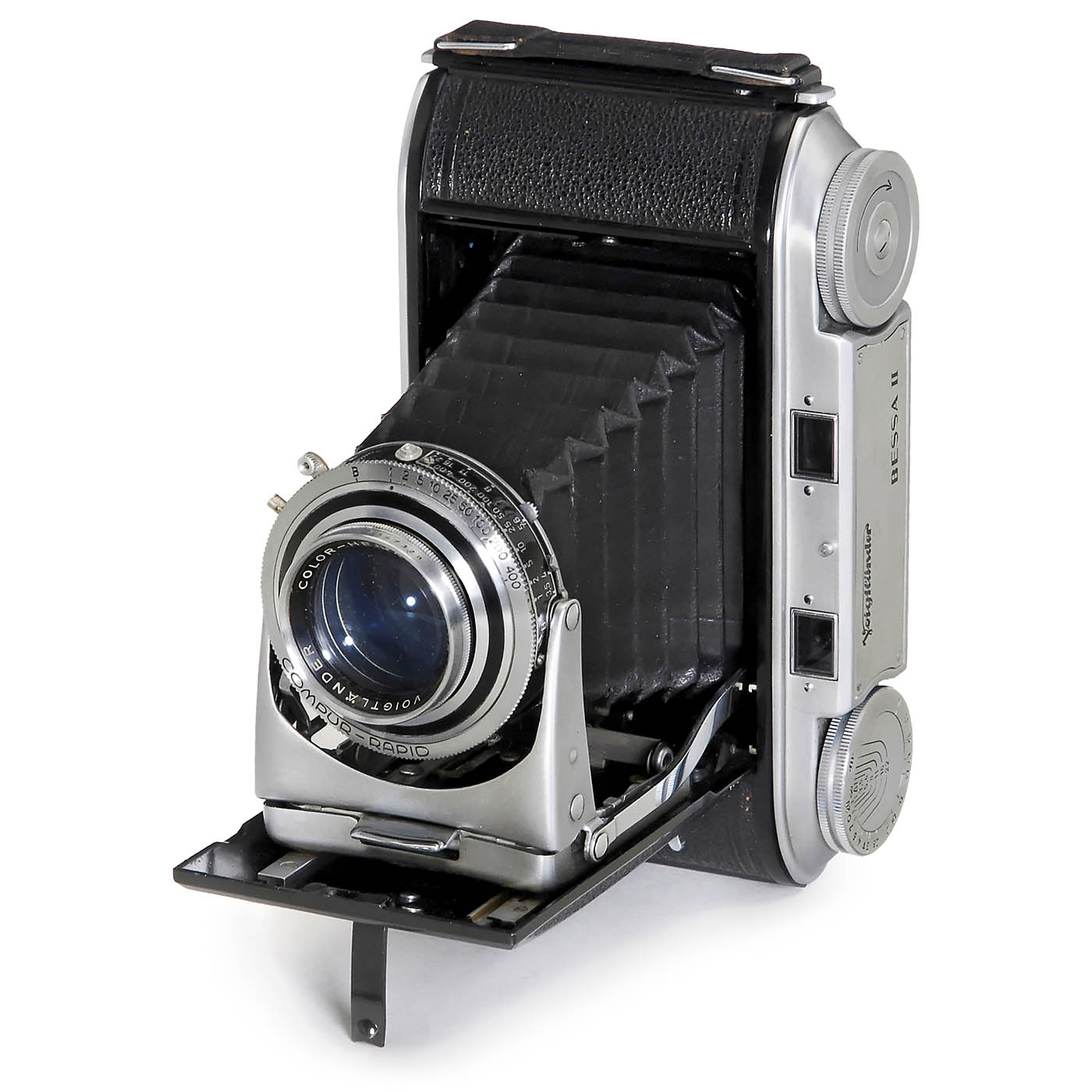 Voigtländer, Braunschweig. Version with clamp rail for accessory shoe. Size 6 x 9 cm on rollfilm type 120, Color-Heliar 3,5/105 mm, no. 3167328, in Compur-Rapid, coupled rangefinder. With original case. - Sought-after camera for collectors and users, in good condition.