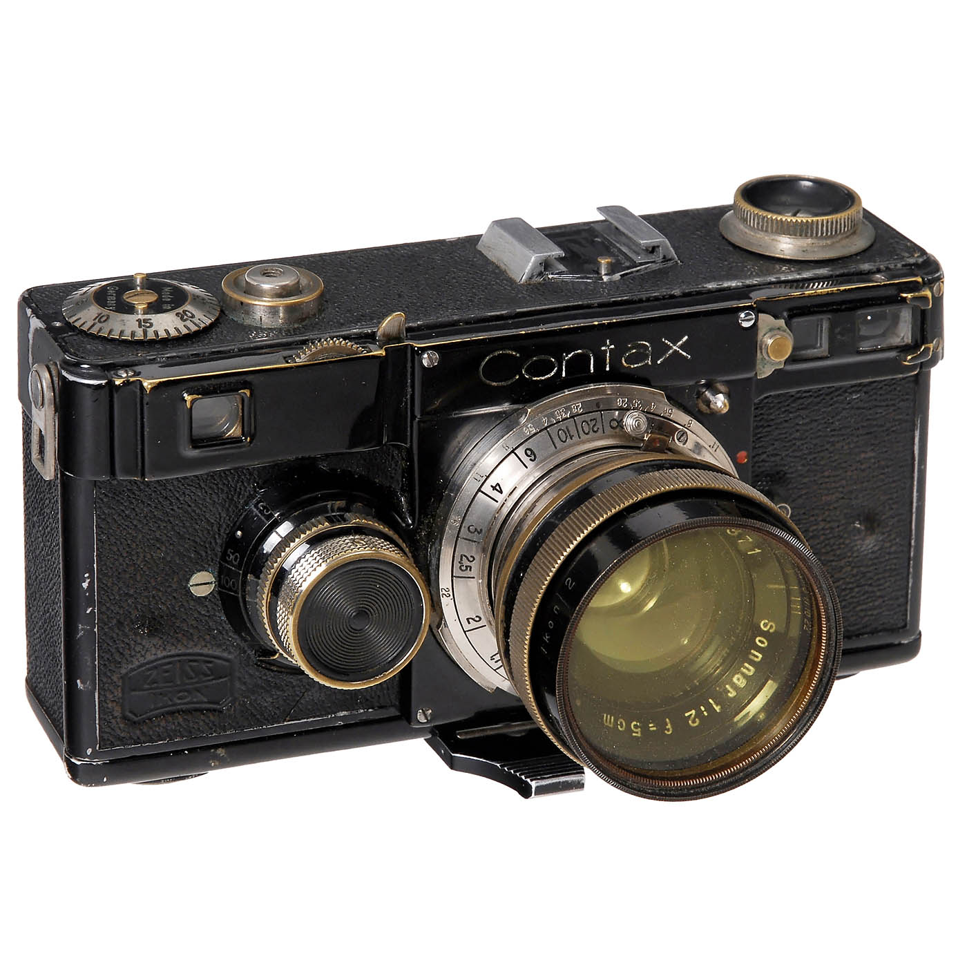 Zeiss Ikon, Dresden. 1) Contax I, no. Y 33049, version 6 with folding foot and engraved with "Made in Germany" on film counter. All shutter speeds work, viewfinder and rangefinder clear and precise, with flash contact in front. With case 1777/8. Fully working camera! (3/2) - And: 2) Sonnar 2/5 cm, no 1605371, front lens with cleaning marks, with Ikon 2 yellow filter. (3/3)