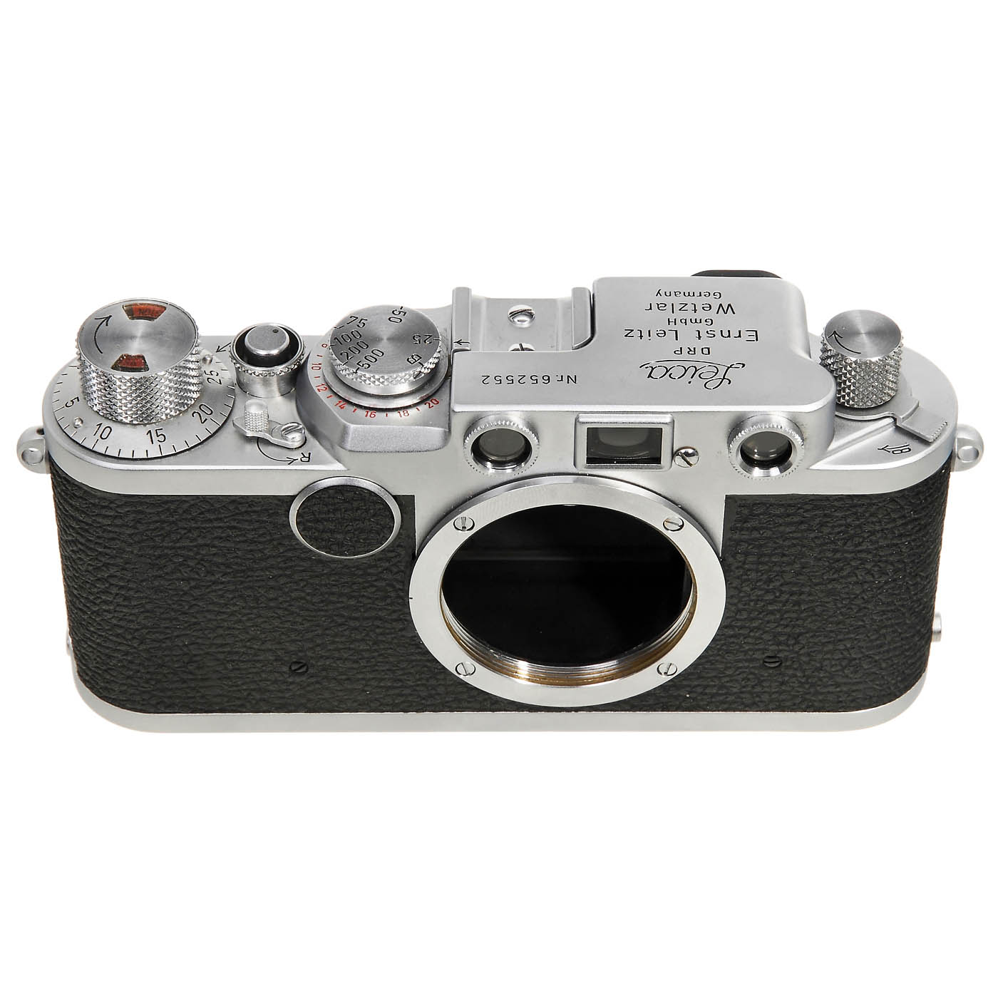 Leitz, Wetzlar. Leica IIf no. 652552, red-dial synchronization, with 1/500 sec. Apart from a tiny dent in the base plate in a very clean condition! Probably never used!