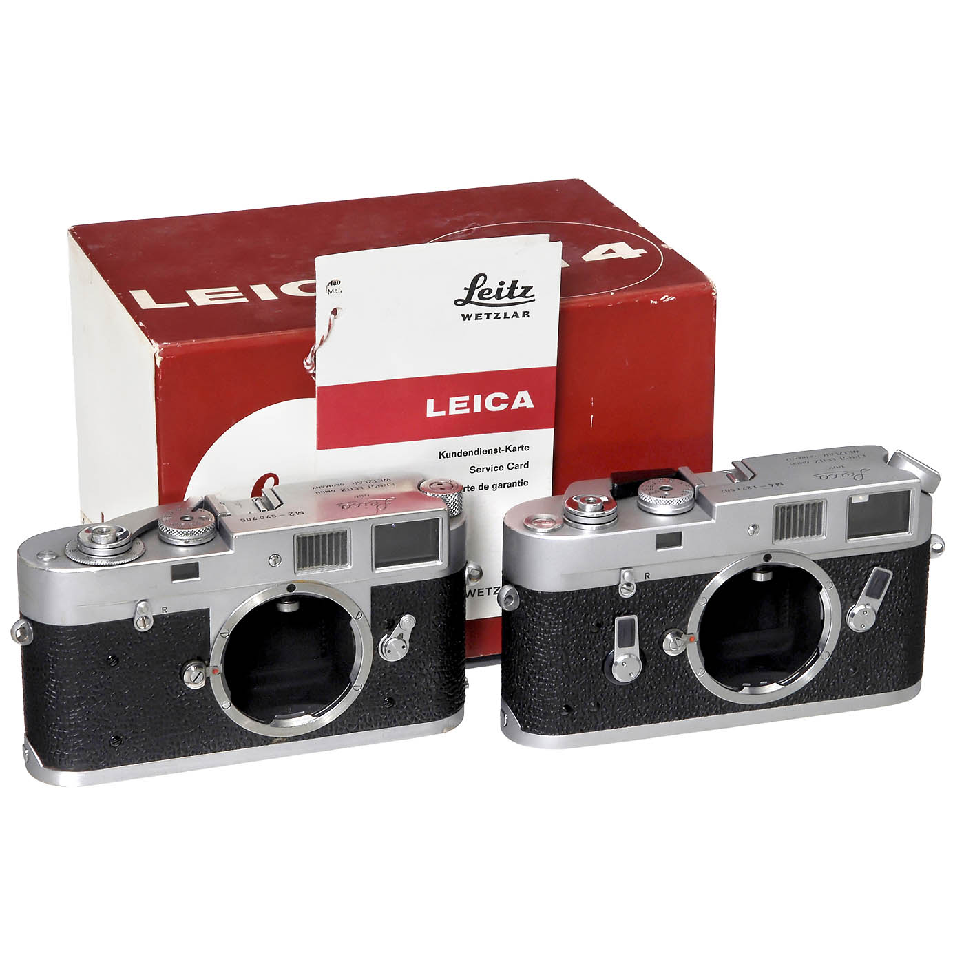 Leitz, Wetzlar. 1) Leica M2, no. 970705, c. 1959, with rapid-loading system 14260 (to be fitted on camera by owner), first curtain uneven but working. Signs of heavy use. With body cap. (4/-) - And: 2) Leica M4, no. 1271507, c. 1970. First curtain defective. Rangefinder, self-timer and frame selector work. With original matched box, service card and body cap. (3-/-) - In addition: Leica-Meter M with booster MBOOWT, with case, working. - Both cameras in need of attention after many years of active service.