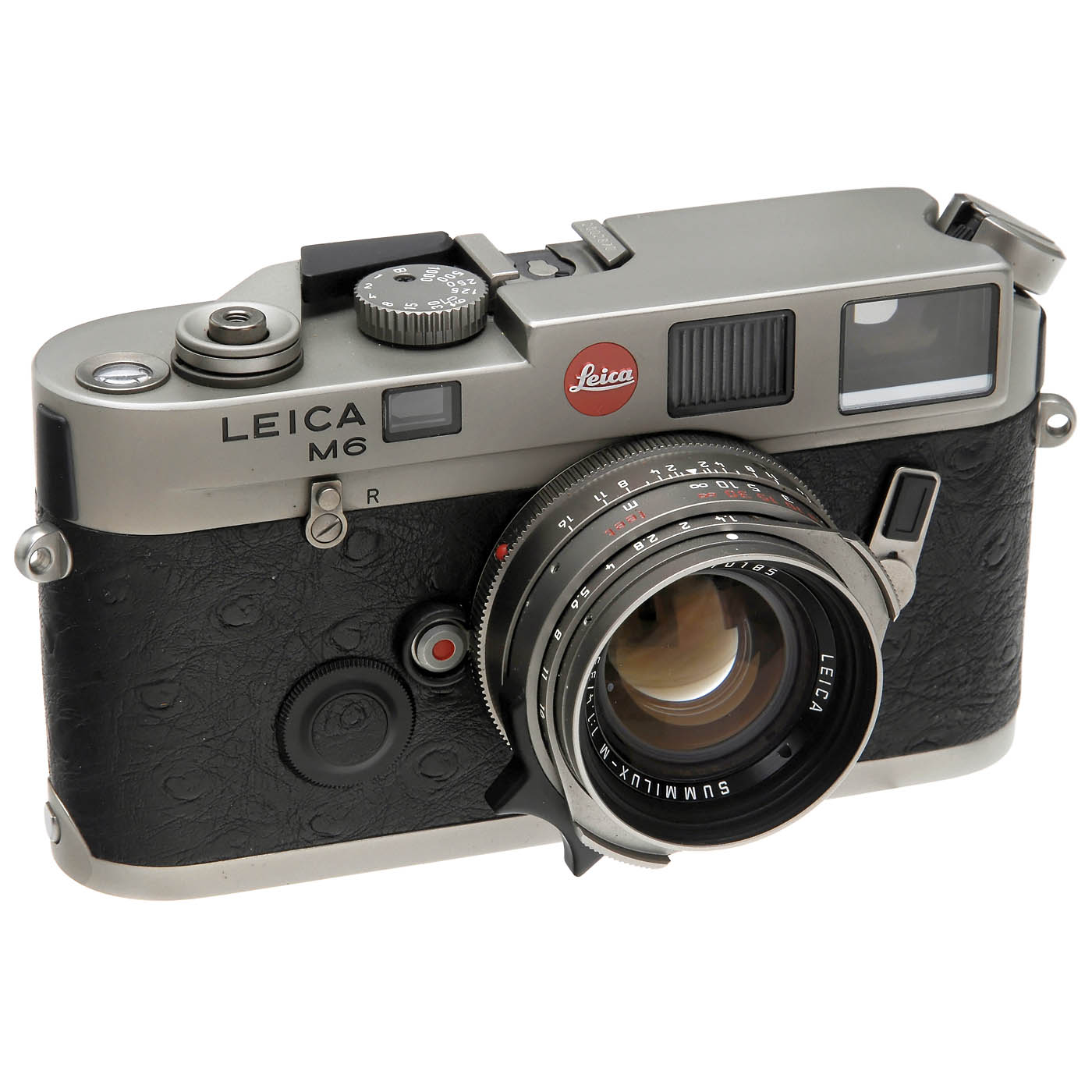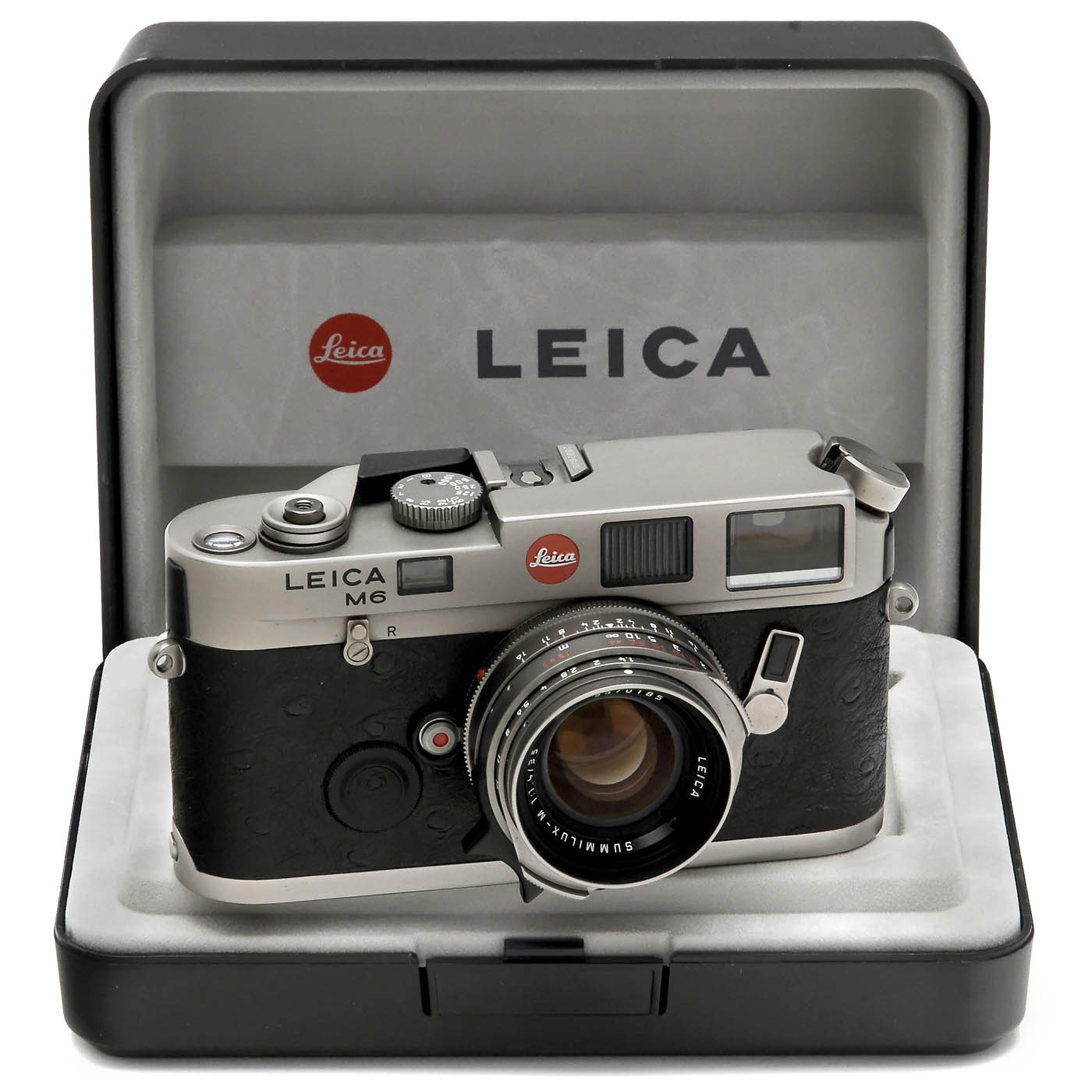 Leica Camera GmbH, Solms. Titanium-plated Leica M6, no. 2002870. With body cap, instructions, warranty card, presentation case and box. Summilux-M 1,4/35, no. 3570185, with back cap, case, warranty card and box. The camera is almost too good to use, but then again, included is a sturdy "Leitz Wetzlar" black leather fitted case.