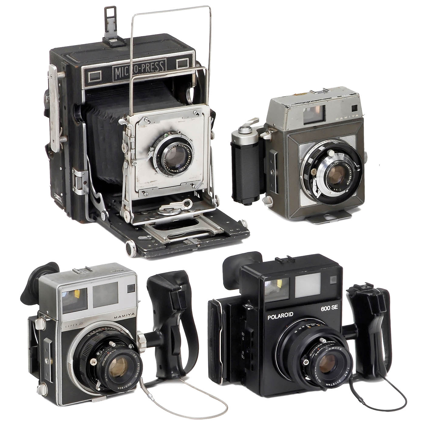 1) Mamiya, Japan. Super 23, for 6,5 x 9 cm, distance meter with minimal error, with 3,5/100 mm, lens and viewfinder clean, with focusing screen back and grip. (4/3) - 2) Mamiya, Japan. 23 Standard, with 3,5/90 mm, lens clean, on back with 6x9 rollfilm holder 120-220. (4/3) - 3) Polaroid 600 SE, with Mamiya 4,7/127 mm and Polaroid back. (2/3+) - And: 4) Micro-Precision, England. Micro-Press 5 x 4, for 4 x 5 in., with Schneider Xenar 4,7/135 mm, lens clean, Compur working, camera inactive, with original focusing screen back. Impressive camera, needs repair! (3/-)