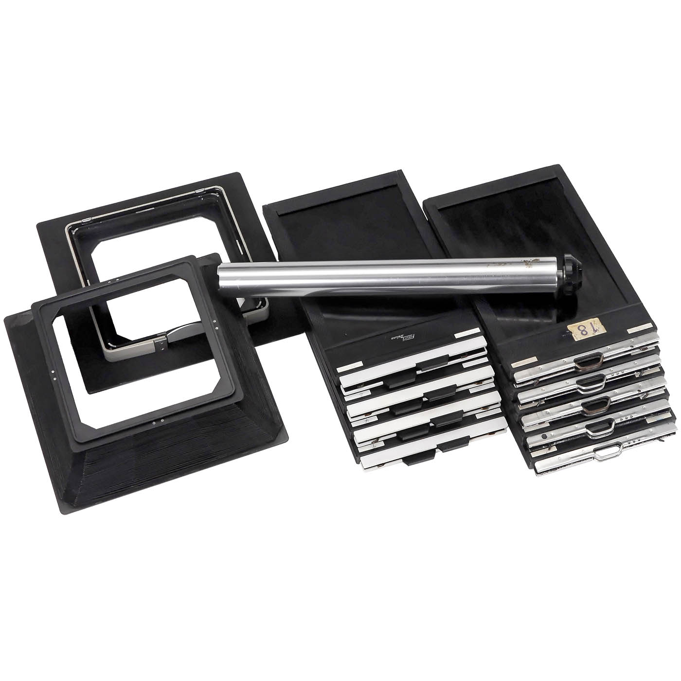 1) Linhof, Munich. Kardan-Bi system, optical bench, for 5 x 7 in./13 x 18 cm, international back with swiveling lever, standard bellows, wide-angle/normal bellows, extension bench 12 in., and adapter back for 4 x 5/9 x 12 cm. (3/3) - 2) 4 x Fidelity Deluxe for 5 x 7 in. (2-/3) - And: 3) 5 x Fidelity for 13 x 18 cm. - Sought after professional camera for large format! (3-/3)