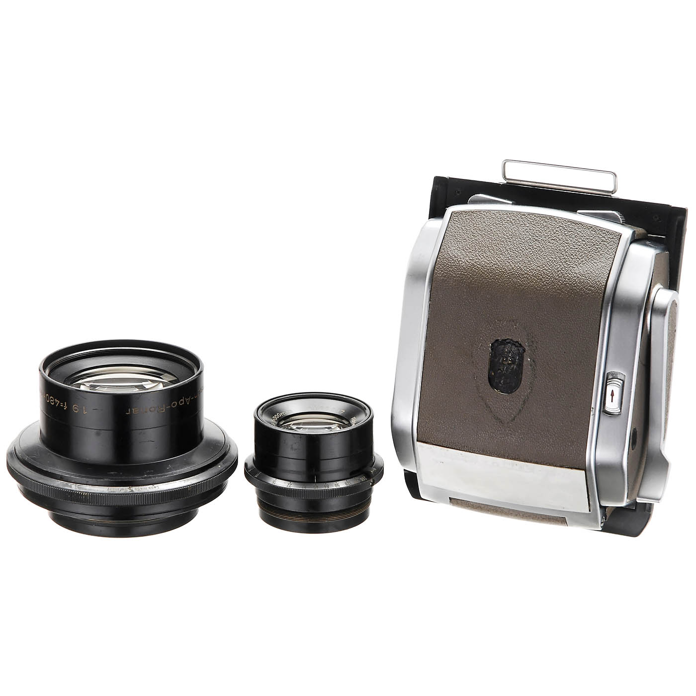 1) Cambo, Kampen. Master Plus, for 4 x 5 in., extension approx. 42 cm, standard bellows, Schneider Super-Angulon 8/75 mm, on camera back with Horsemann 6 x 9 rollfilm holder. With original case. (2/2) - 2) Linhof Super Rollex 56 x 72, on 4 x 5 in. adapter. (3/3) - And: 3-4) Rodenstock Apo Ronar 9/300 mm and 9/480 mm, c. 1960. (3/3)