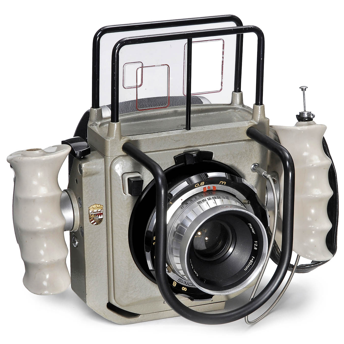 Linhof, Munich. Aerial camera for vertical format 56 x 72 mm, no. A 10137, changeable lens board, with Zeiss Planar 2,8/80 mm, no. 3463343, Synchro-Compur shutter and film transport by rotating built-in anatomical grip, all working, rotating back with Cine-Rollex cassette.