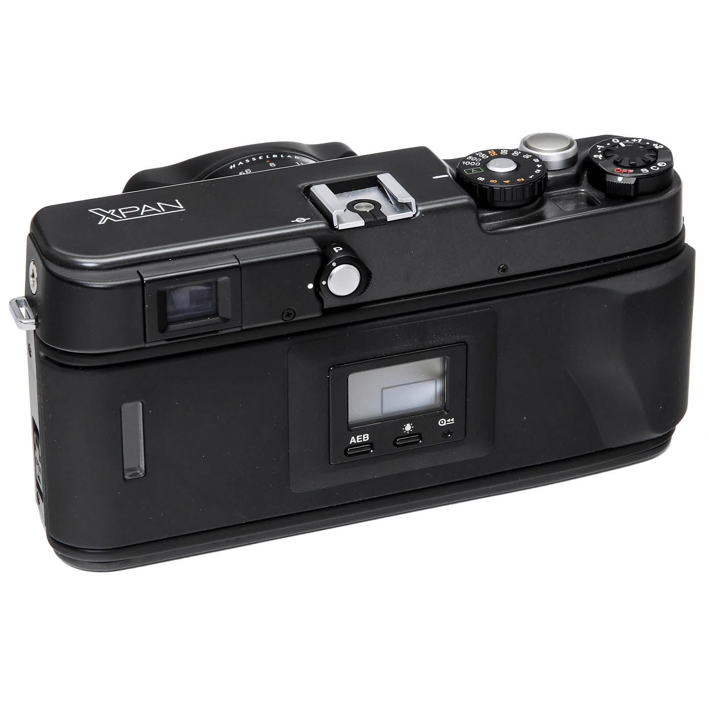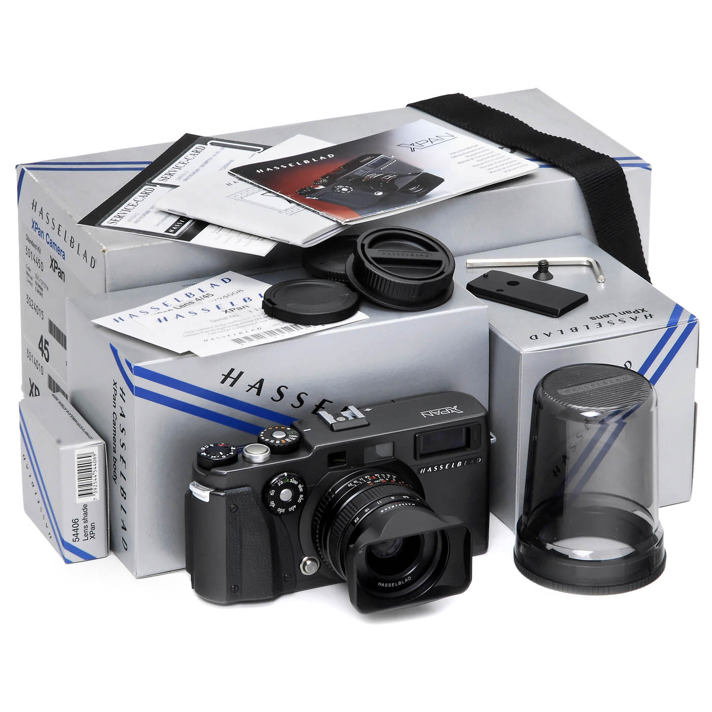 Hasselblad, Sweden/Japan. Xpan, no. 11SV24511, with Hasselblad 4/45 mm, no. 8YSH24008. Rangefinder camera for panorama size 24 x 65 mm or 24 x 36 mm on 135 film. A top camera in top condition with less than 300 exposures! With hood, camera strap, tripod adaptor, instructions, service cards with matched numbers, transparent tube and 3 boxes. Included are all caps for lens and body.