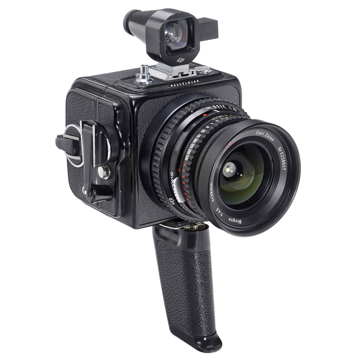 Hasselblad, Sweden. No. UPW 11889, Zeiss Biogon 4,5/38 mm, no. 5238607, cap, special viewfinder and magazine back 12. With good handgrip from Austria.