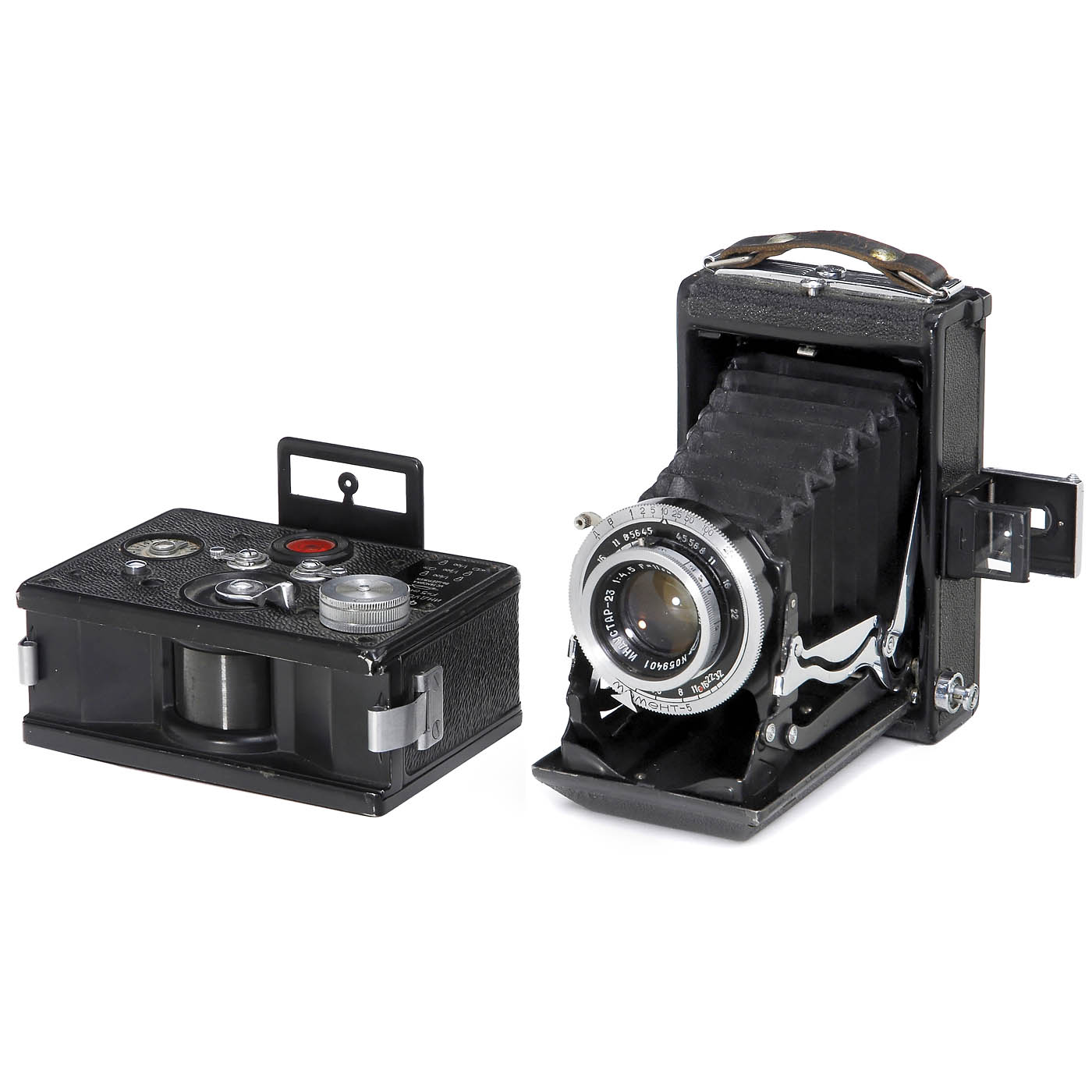 1) Binoca, Japan. 16mm subminiature camera Binoca with built-in opera glasses, no. 107160, version in white/gold. Bicon 4,5/40 mm, shutter 1/25-1/100 sec. and B. Bakelite undamaged but without front covering. Individual focusing eyepieces 2,5 x 25. - 2) USSR. Panoramic camera FT-2, 1963, 24 x 110 mm on 35mm film, Industar 3,5/50 mm, shutter speeds 1/100-1/400 sec. With the 2 special cassettes. (3/2) - And: 3) USSR. Folding camera 6,5 x 9 cm MOCKBA-3, Industar-23 4,5/11 cm. With 5 cassettes and case. (3/3)