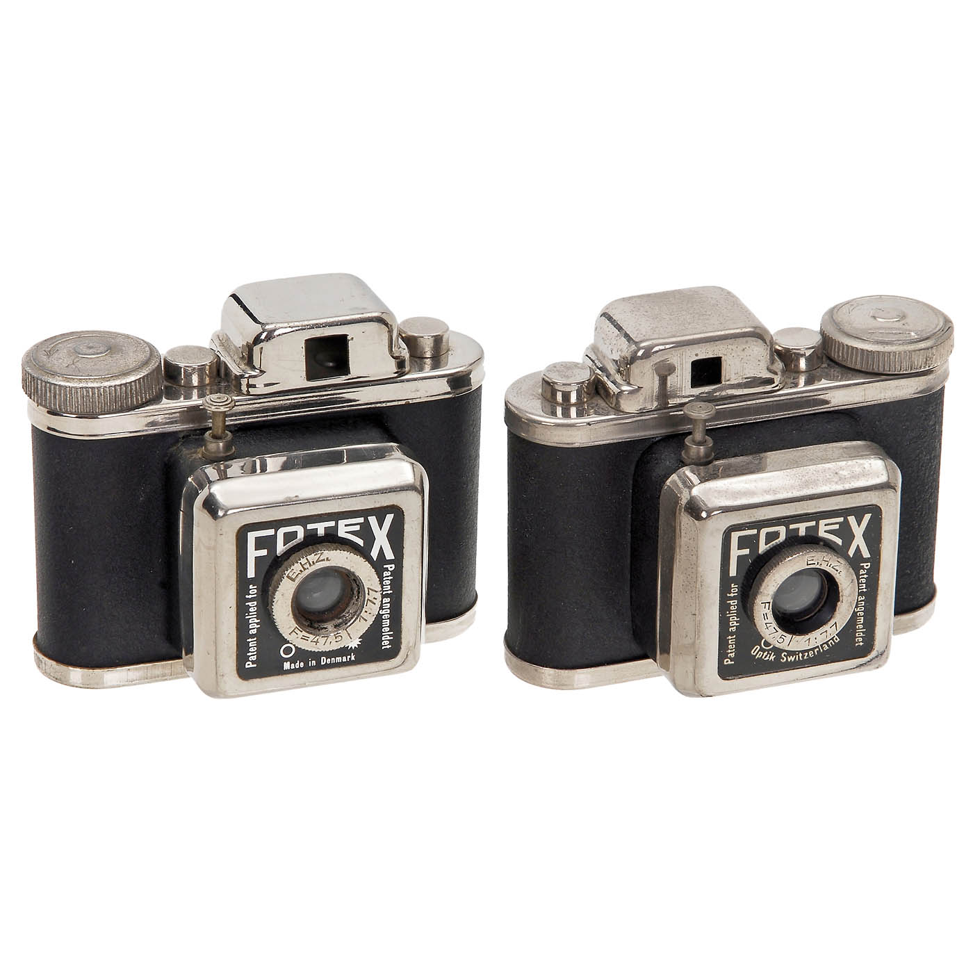 1-2) Fotet Camera, London. Fotex 4 x 4 rollfilm cameras for 127 film, c. 1932 (production by Kochmann), E.H.Z. 7,7/47,5 mm. Both models "Optik Switzerland" and "Made in Denmark", rarely seen together! (3/3) - And: 3) Concava, Switzerland. Tessina automatic 5, c. 1960. Spring motor for 35mm film in special cassettes. Amongst the smallest analog TLR cameras in the world! Screw under shutter release replaced. Sports viewfinder, exposure table. (3/3)