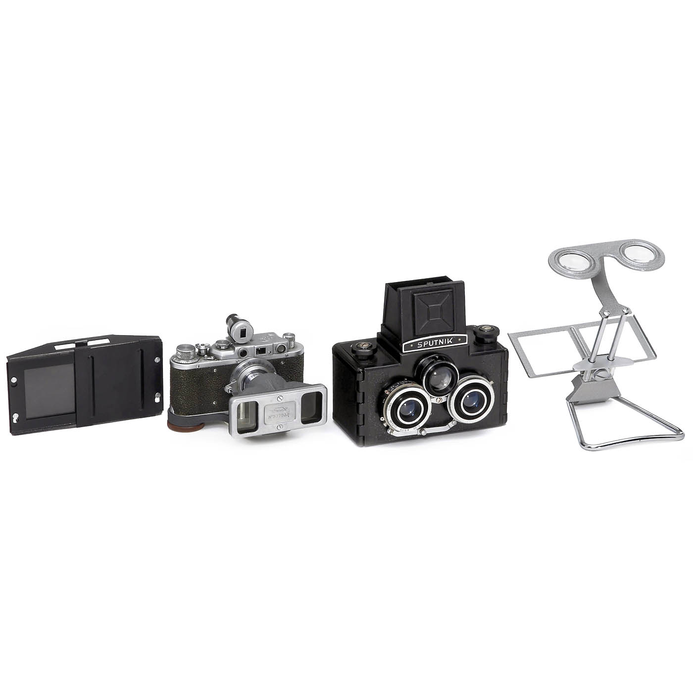 1) Fed, USSR. Fed from 1966 with Fed 3,5/50 mm and stereo-attachment with viewfinder, inside some fog. All else: (3/3) - And: 2) GOMZ, USSR. Sputnik, 1955, for 120 film for stereo exposures of 6 x 6 cm, T-22 Lomo 4,5/7,5 cm, viewer lens with lens separation, with case, stereo viewer, copying frame, caps and box. (3/3)