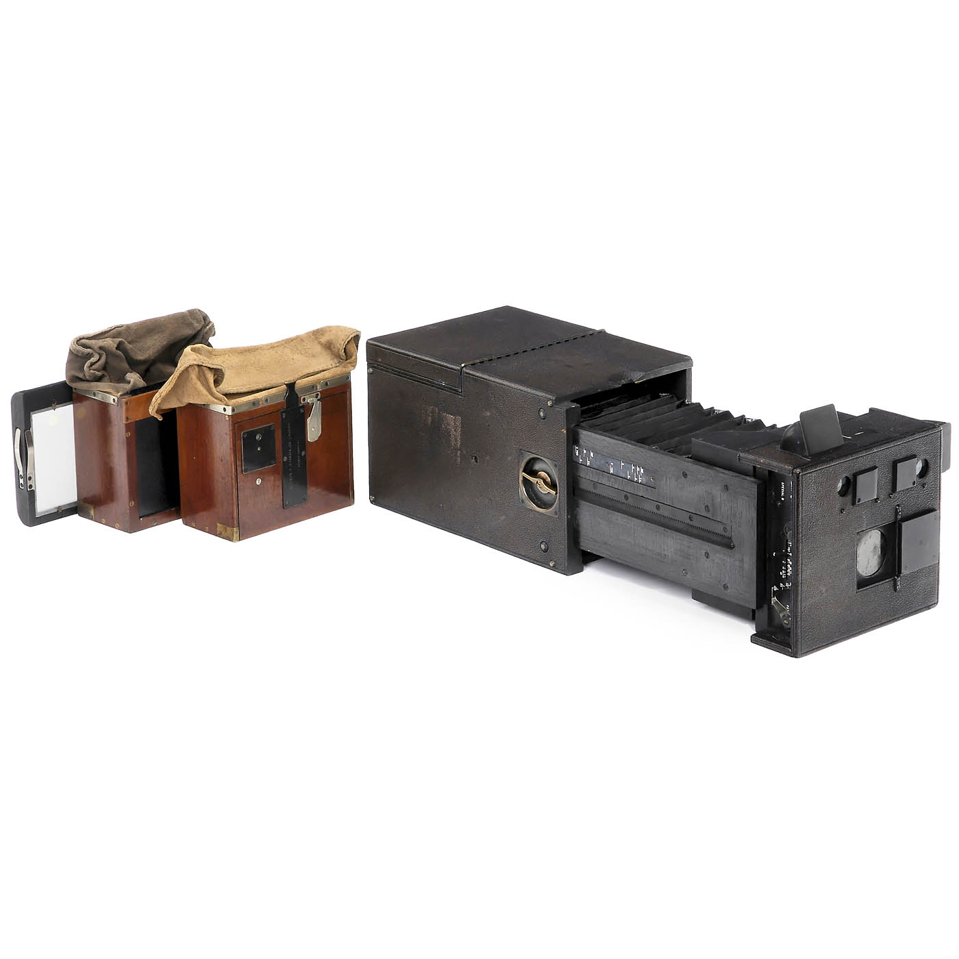 Newman & Guardia, London. For quarter plate, no. SB1304, marked "RoNo200964", with Zeiss Protar lens 12,5/224 mm, no. 44421, and 12,5/285 mm, no. 44711, in bayonet mount, together 7,2/145 mm. With 3 distance scales for 145, 224 and 285 mm, total extension is 447 mm, cameras normal length 265 mm. Shutter working, with focusing screen back and 2 magazines, both complete with pressure plate and the 12 plate holders. Excellent condition!