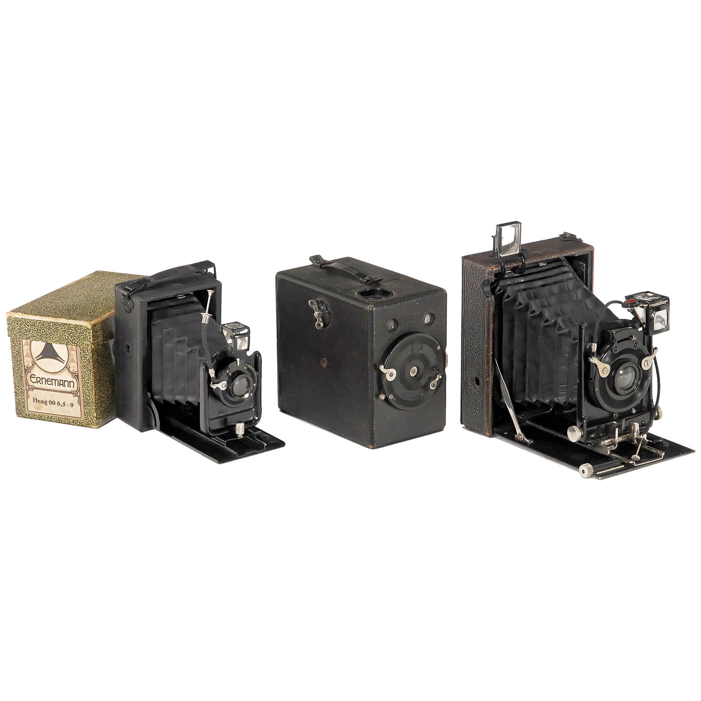 Ernemann, Dresden. 1) Heag 00 6,5 x 9, Doppel-Objektiv 11/10,5 cm, with focusing screen back, 2 cassettes, film cassette and 2 sets of Danish instructions, in original box with retailer's label from Copenhagen. Like new! (2/2) - 2) Heag XII, Ser. I, 9 x 12 cm, Ernemann Detektiv Aplanat 6,8/13,5 cm, working. (3/3) - And: 3) Rollfilm box for 6 x 9 cm. (3/3)