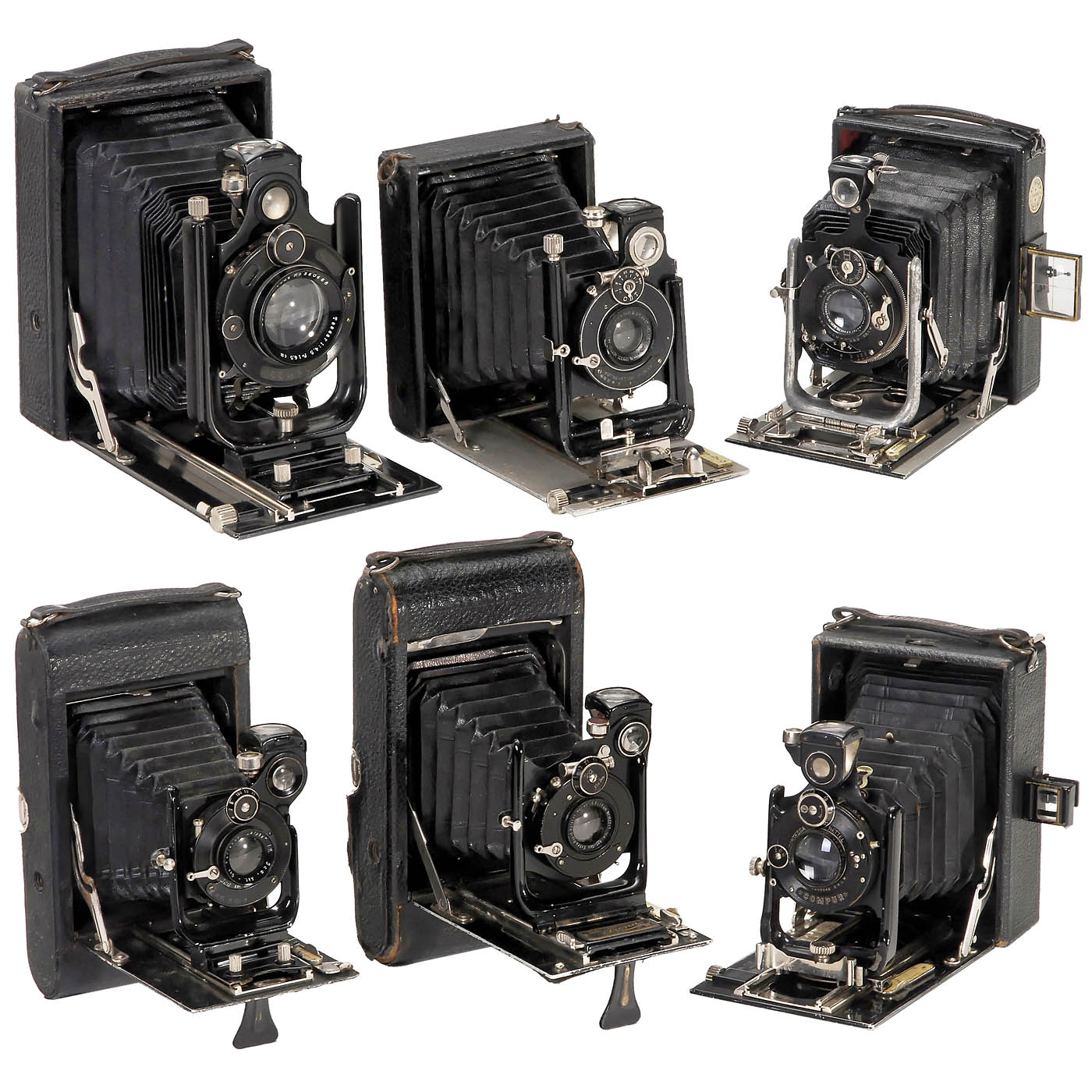 All cameras with focusing screen back. 1) Wünsche, Reick. Minimal (later Ica-Minimal 235) for 9 x 12 cm, no. (Ω) 212581, Goerz Syntor 6,8/135 mm, French inscription, retailer's label "Alibert Paris", without level. (3/3) - 2) Hüttig AG, Dresden. Without name. For 9 x 12 cm, no. A16394, Hüttig Extra Rapid Aplanat Helios 6,8/130 mm. (3/3) - 3) Ica, Dresden. Trona 515, no. A 91524, changeable lens Ica Extra Rapid Aplanat Helios 6,8/13 cm, no. 182217. (3-/3) - 4) Halloh 505, no. G64591, Ica Periskop Alpha 1:11. (3/3) - 5) Maximar 207, no. G36992, replaced lens Tessar 4,5/12 cm. (3-/3) - And: 6) Orix 308, no. G56918, for 10 x 15 cm, Zeiss Tessar 4,5/16,5 cm. (3/3)
