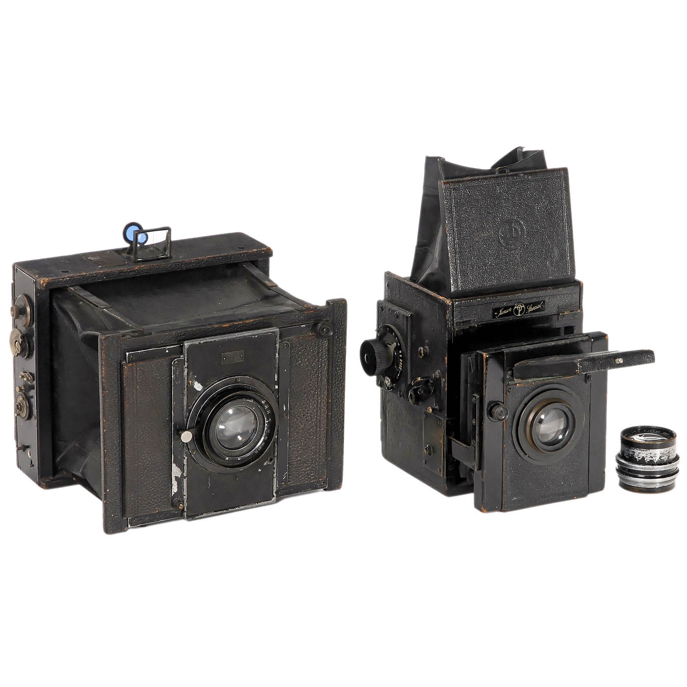 All with focusing screen back. 1) Zeiss Ikon, Dresden. Nettel 9 x 12 cm, cloth good, works, Contessa Nettel focusing screen back for thin paper cassettes (Hemera), scale for Tessar 15 cm and Tele-Tessar 25 cm, without lens board. (4/3) - With Tele-Tessar 6,3/25 cm. (4/4) - 2) Goltz & Breutmann, Dresden. Mentor folding-reflex 10 x 15 cm, cloth good, works only intermittently on "Z" setting, Tessar 4,5/21 cm in normal mount instead of 4,5/16,5 cm in helicoid mount. (3/3-) - 3) Thornton-Pickard, England. Junior-Special, Reflex for 6 x 9 cm, cloth dry, works intermittently, with 2 appropriate lenses: Cooke Anastigmat 4,5/5 in. and Ross Homocentric 4,5/155 mm 6 1/8 in., coated and clean. (3/-) - And: 4) Goerz, Berlin. Ango 12 x 16,5 cm. (5/-) - With Celor 4,5/180 mm, glass sufficient. The Celor would make a suitable replacement lens for Mentor folding reflex. (3/4)