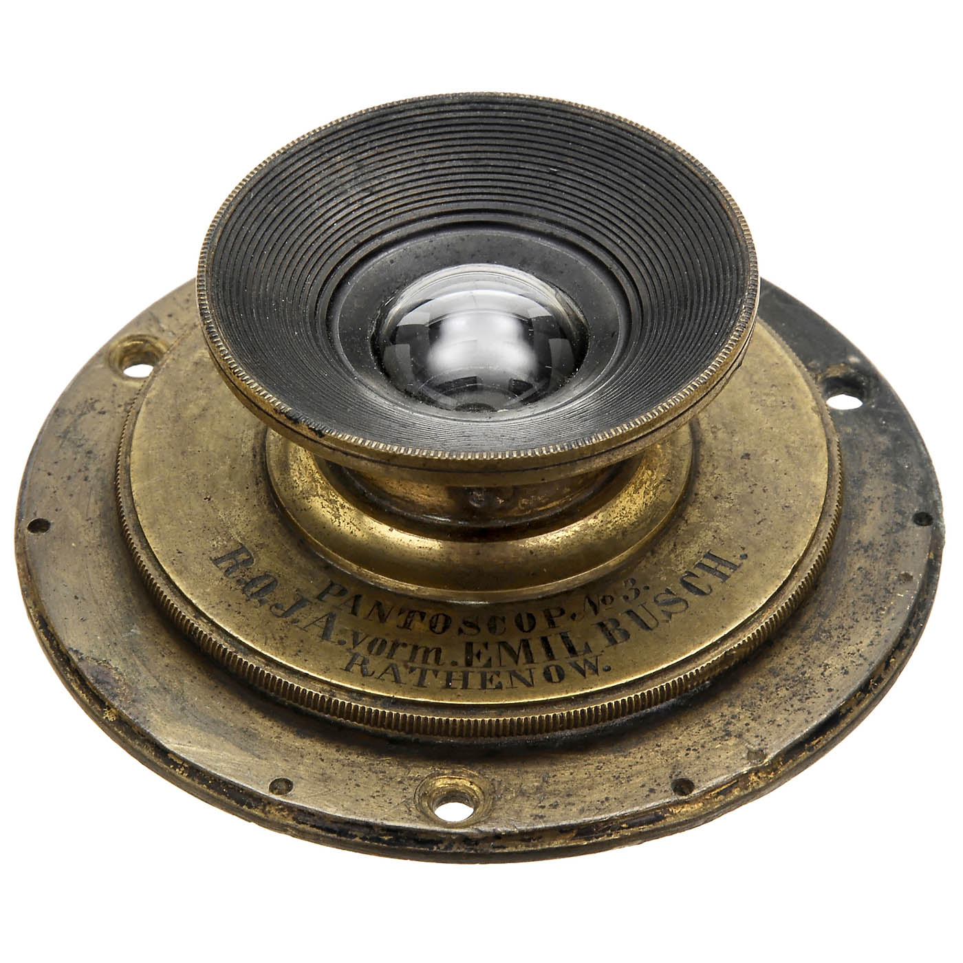 R.O.J.A. vorm. Emil Busch, Rathenow. Wide-angle lens with approx. 22/12 cm focal length, height of the lens 1 2/5 in., sunshade front lens Ø 1 ½ in., front element with minor lens separation in one corner - insignificant for practical work with right-angled format. Glass very clean, with connecting ring, waterhouse stop replaced. - Emil Busch recounted how he found the optimal lens form by grinding more and more curved achromatic lenses. The Pantoscop was the only anastigmatic wide-angle on the world market before the development of new glass types enabled the calculation of anastigmat lenses.