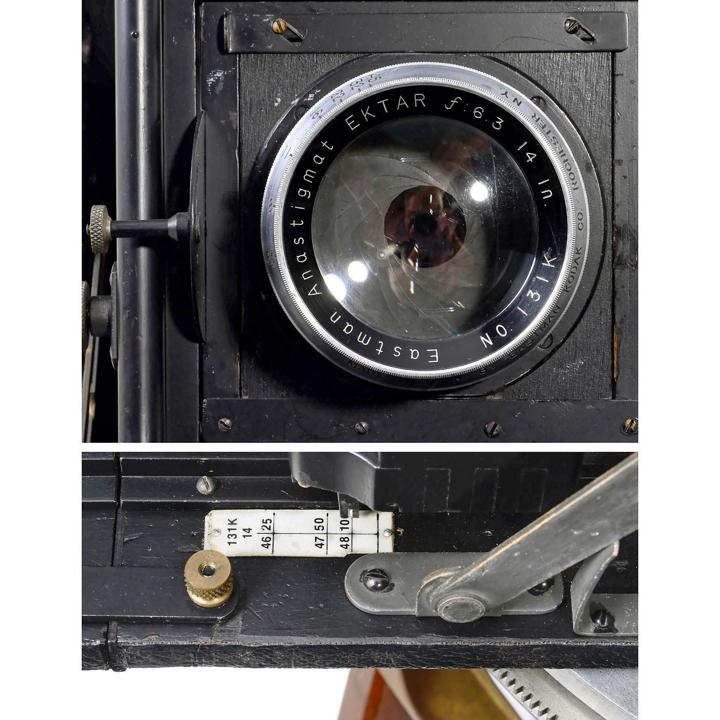 Folmer & Schwing, Rochester. Camera no. 99, for 10-, 8- or 6-inch films. Complete set: with tripod, tripod head, front swing- and tiltable, folding front can be dropped. Version for Kodak Anastigmat Ektar 6,3/12 in., no. 131K (non-convertible lens, sharper in open stops), on baseboard original scale for 131K and the 3 focusing settings, with all gears: 46, 47 and 48, with 2 winding heads and 2 cases. With later prototype of a tilt head where the 3 gears work on extension pieces through an adjustable socket joint depending on angle of inclination. With copy of instructions and 7 unopened films from 1995-2001, 2 x Verichrome Pan film 8 in. x 5 ft., 3 x Vericolor III Professional 10 in. x 6 ft., 1 x Pro 400 Film and 1 x Vericolor 400. With Double-X-Aerographic Film 2405 Sp981 of 9 ½ in. x 250 ft. Enough film material and spools for professional work! - Original outfit in working condition!