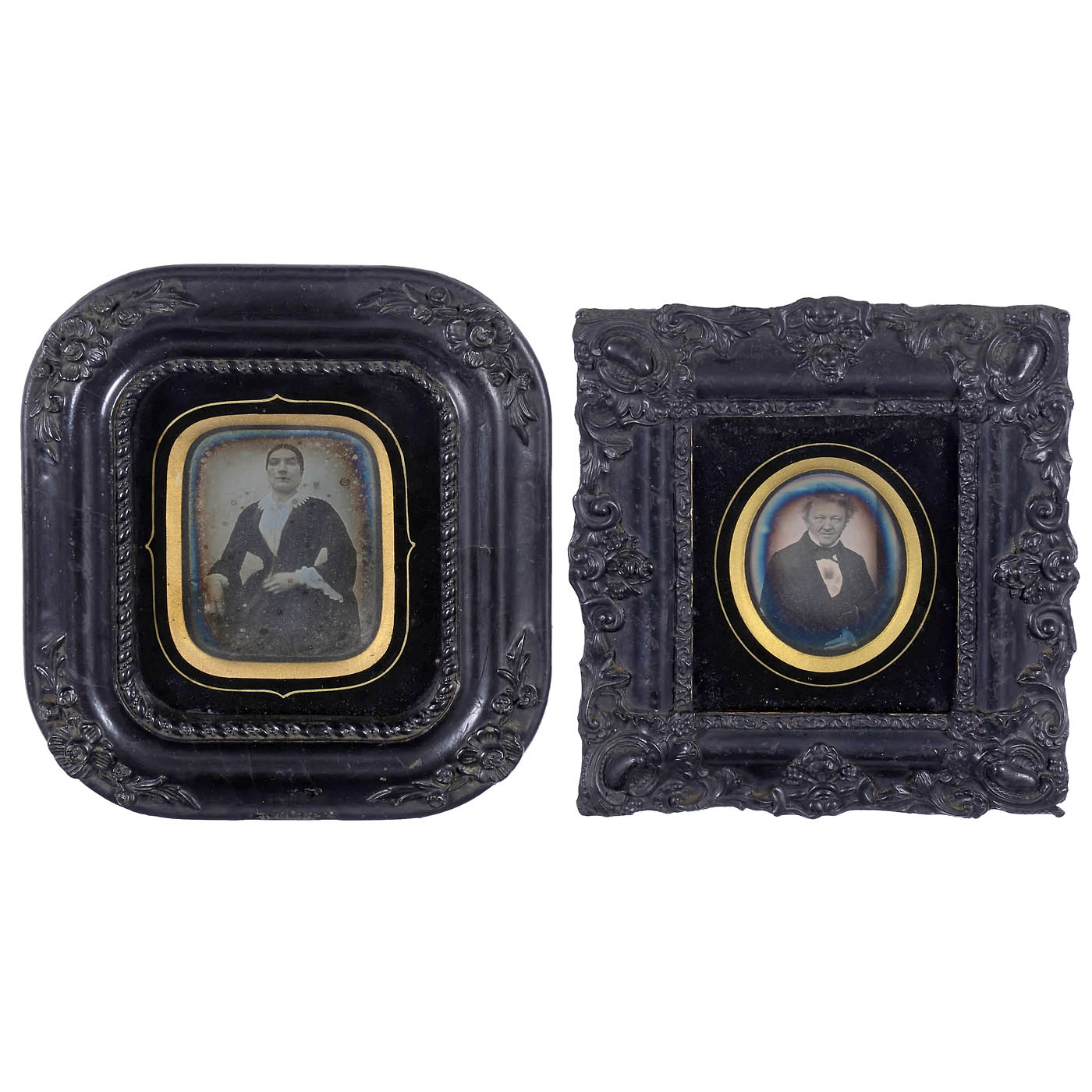 Both unopened, the covering glass would benefit from being cleaned. 1) Frame 18,5 x 20,5 cm, picture 7,5 x 6 cm, a charming gentleman with artistic hair. - And: 2) Frame 19,5 x 22 cm, picture 7 x 9 cm, photo-technically interesting picture of all optical mistakes from the dawn of the métier - too little studio space, too short a focal length, too little distance from the subject. Above the wasp-like waist towers a voluminous bosom and perched on top a head that appears too small for its owner. The effect recalls the anamorphic caricatures seen in editions of "Punch" and "Vanity Fair" during the 19th century. With gilt decoration.