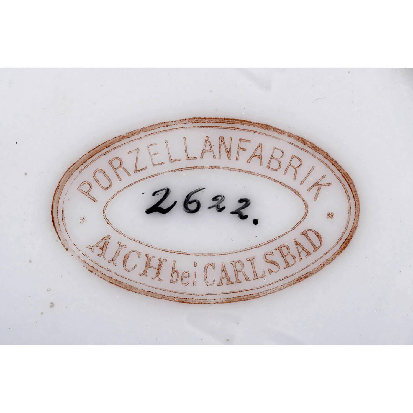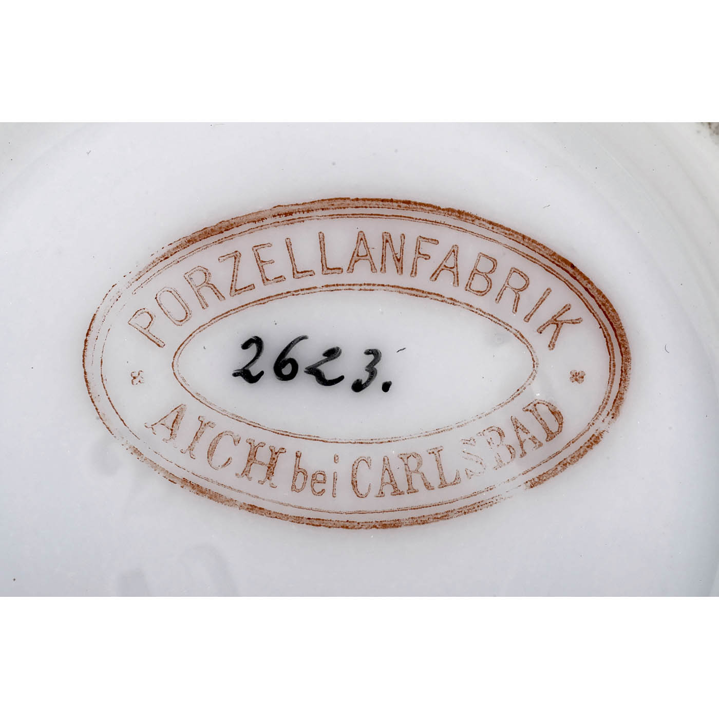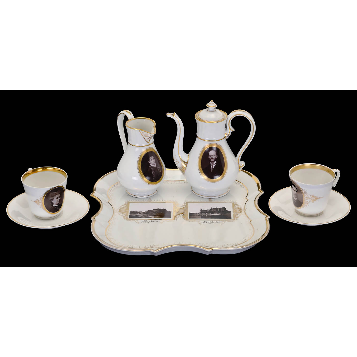 1-2) Porzellanfabrik Aich bei Carlsbard. Coffee pot, no. 2622, height 7 in., milk pot, no. 2623, height 5 ½ in. - 3-4) 2 cups, 2 6/7 x 3 in., 1 with repaired crack, saucers 5 ½ x 1 in. - And: 5) Tray, 12 x 12 in., back with stamp in capitals "MEISSEN", with 2 photographs of the Albrechtsburg Castle of Meissen. - A very attractive service with the elegance and discrete charm of the late Biedermeier period.