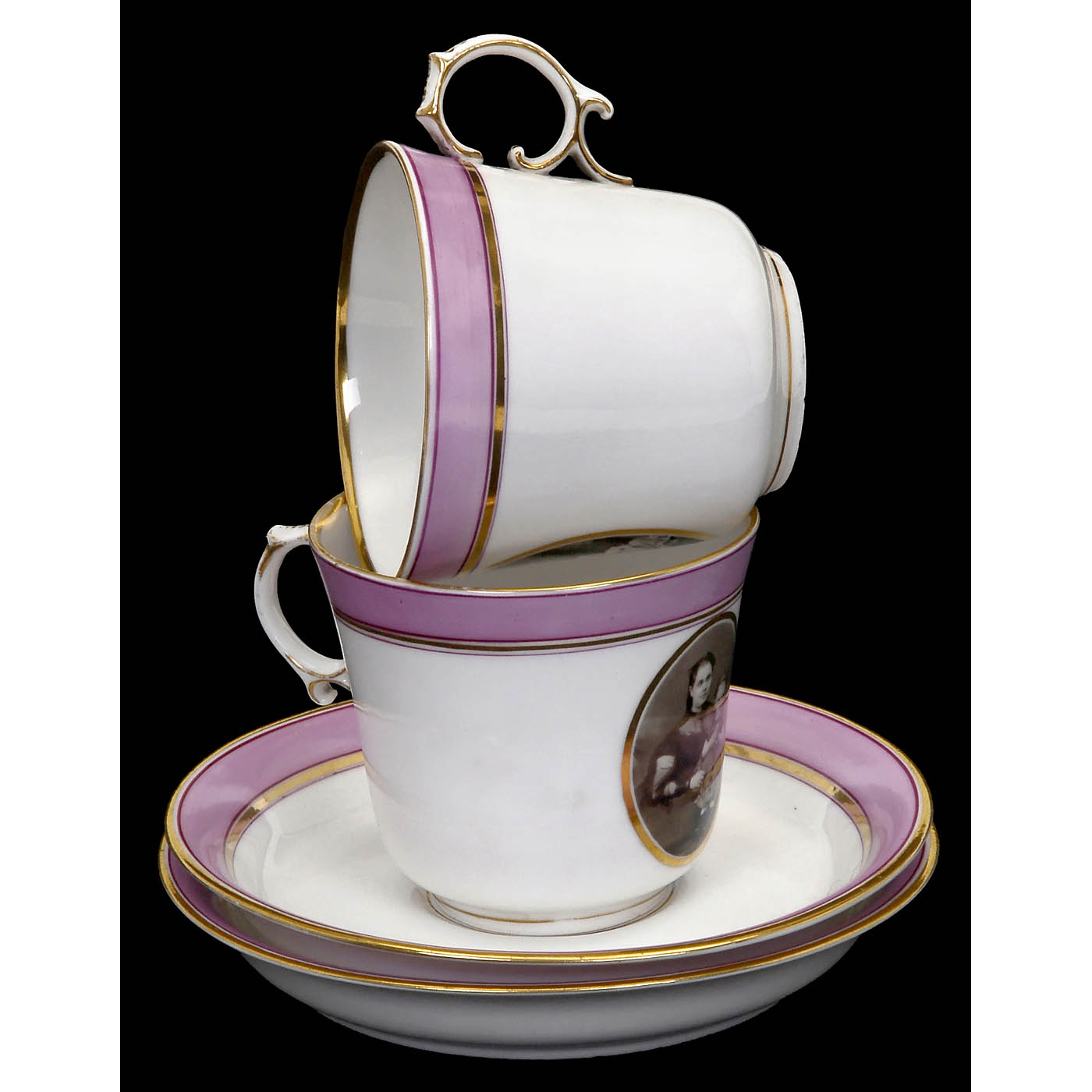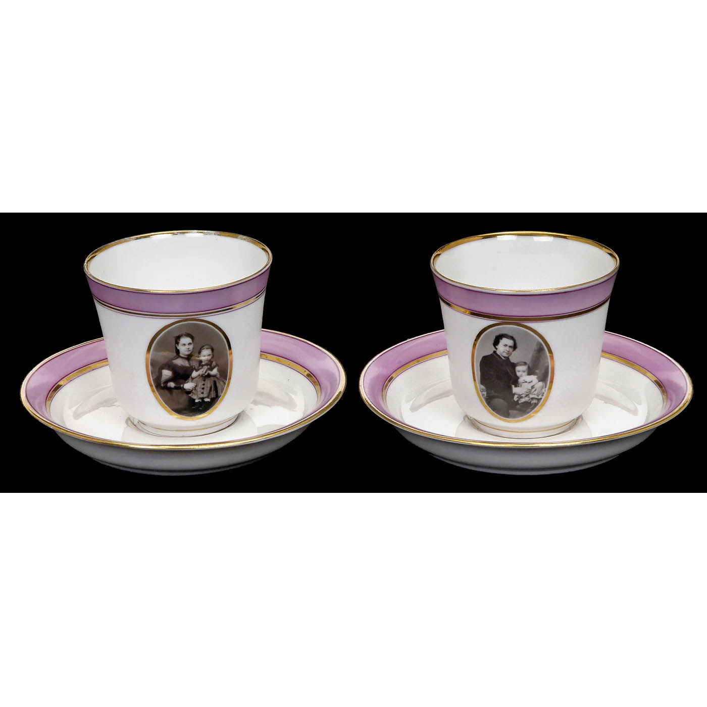 1-2) Coffee cups, couple with children, lilac decoration, with seal, cups 7,5 x 8 cm, saucers 14,2 x 2,2 cm. Very attractive photo cups from late Biedermeier period - 3-7) 5 assorted cups. - 8) Heubach. Vase, "Kongenrider over Grænsen", 17 x 10 cm. - And: 9) Sugar pot, 11 x 13 cm, with seal "Familie Steiner".