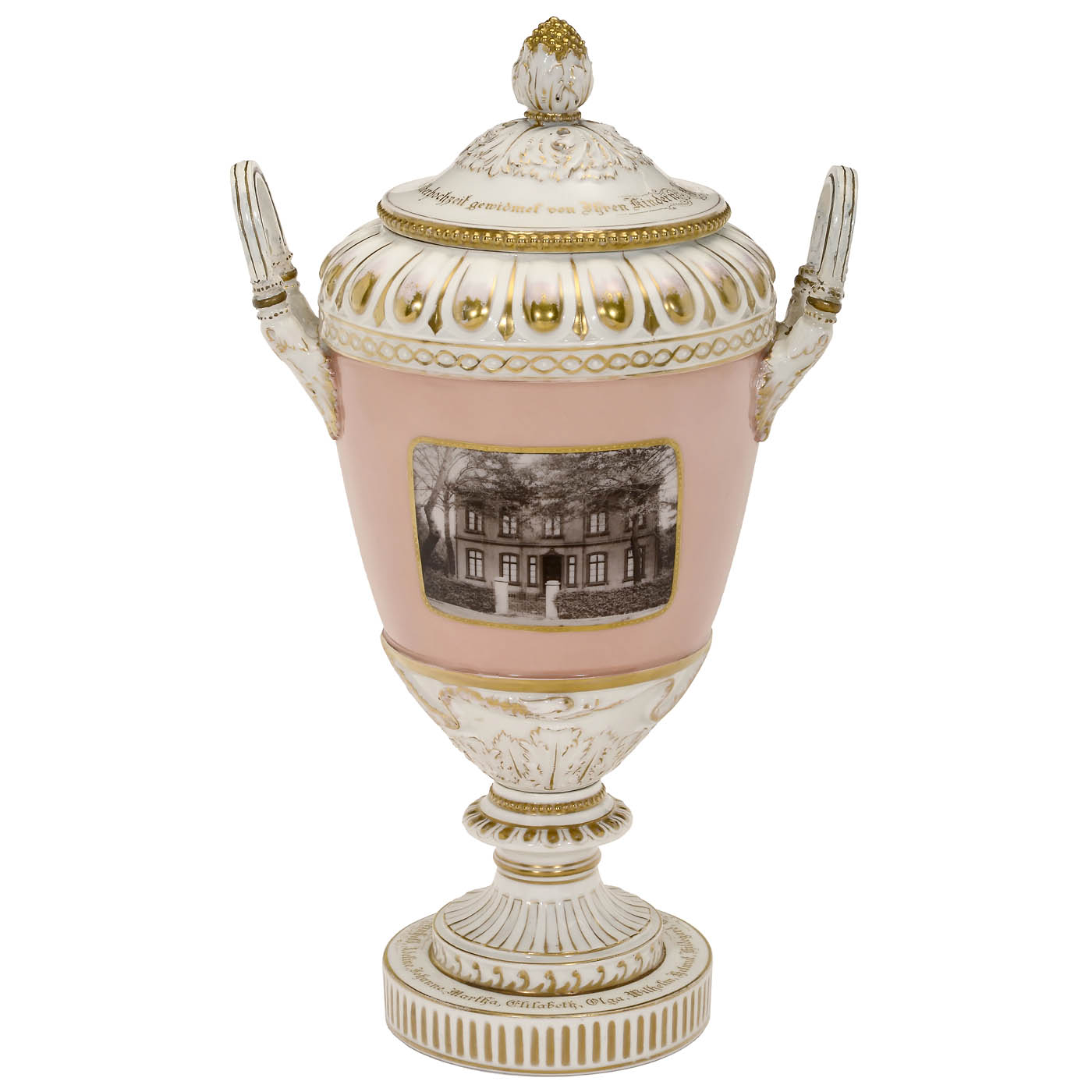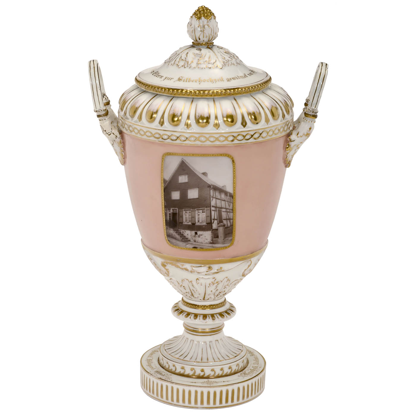 KPM, Berlin. Classical style, on pedestal, with lid, height 14 in., lid with silver-wedding dedication, with two photographs, on the back an old half-timbered house, on the front a comfortable villa. The pedestal shows the names of the ten children. A wonderful exhibition piece from the "Gründerzeit" of Germany.
