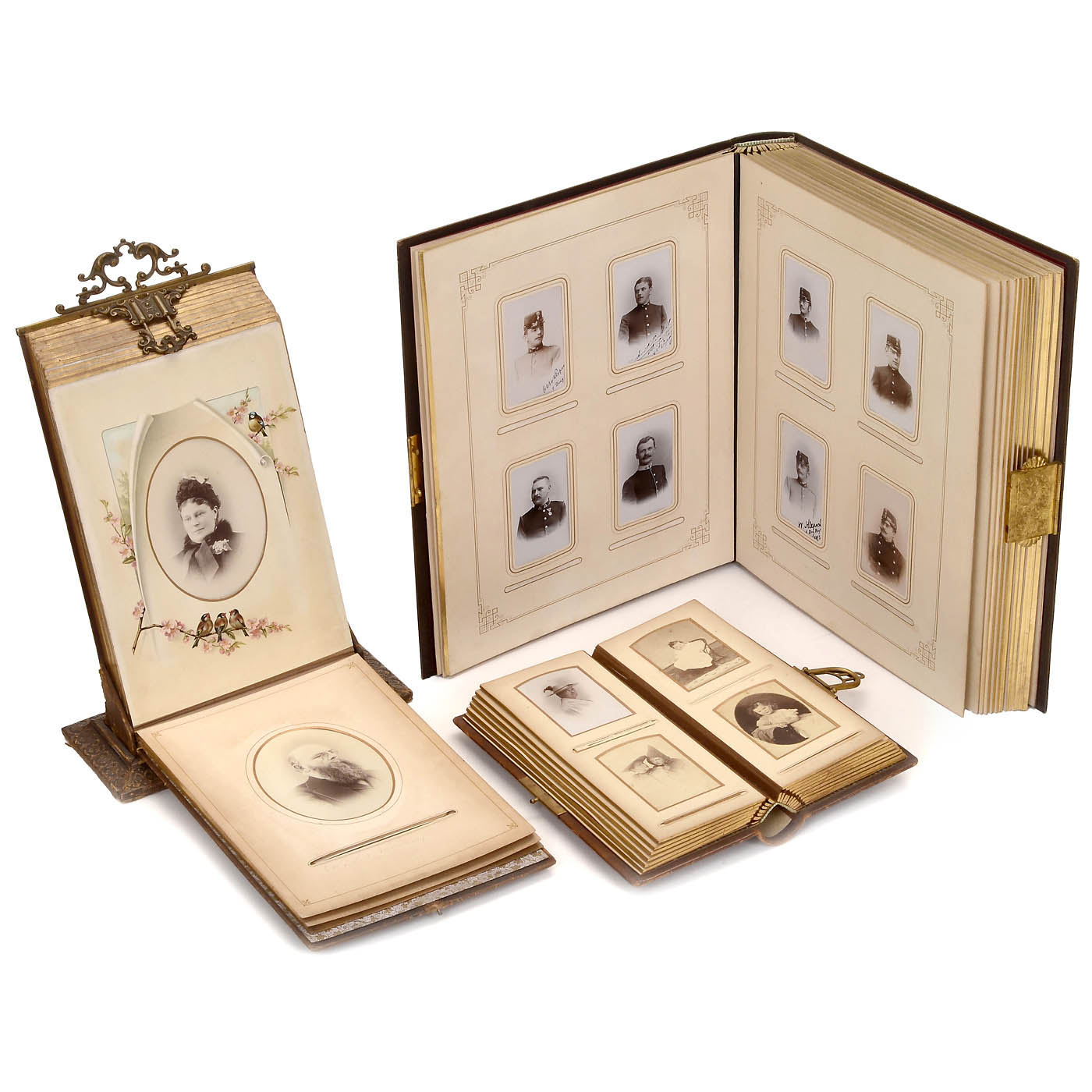 1) August Klein, Vienna, Graben no. 20. Luxury album 12 x 15 in., red-silk interior, with 13 pages for 52 cartes-de-visite, near-mint, with a letter to an Imperial Austrian regiment, Erzherzog Ludwig Victor Reg. 65, the grand duke Ludwig Victor Reg. 65 from 9. May 1866. (2/2-) - 2) England. Upright album, 8 x 13 in., on base 8 x 12 in., 13 pages, with photos of the Mounsey family, Sunderland. (3-/3) - And: 3) Germany. Album 4 ½ x 10 in., with 15 pages for 60 cartes-de-visite and portraits from the Stuttgart region. (3/3)