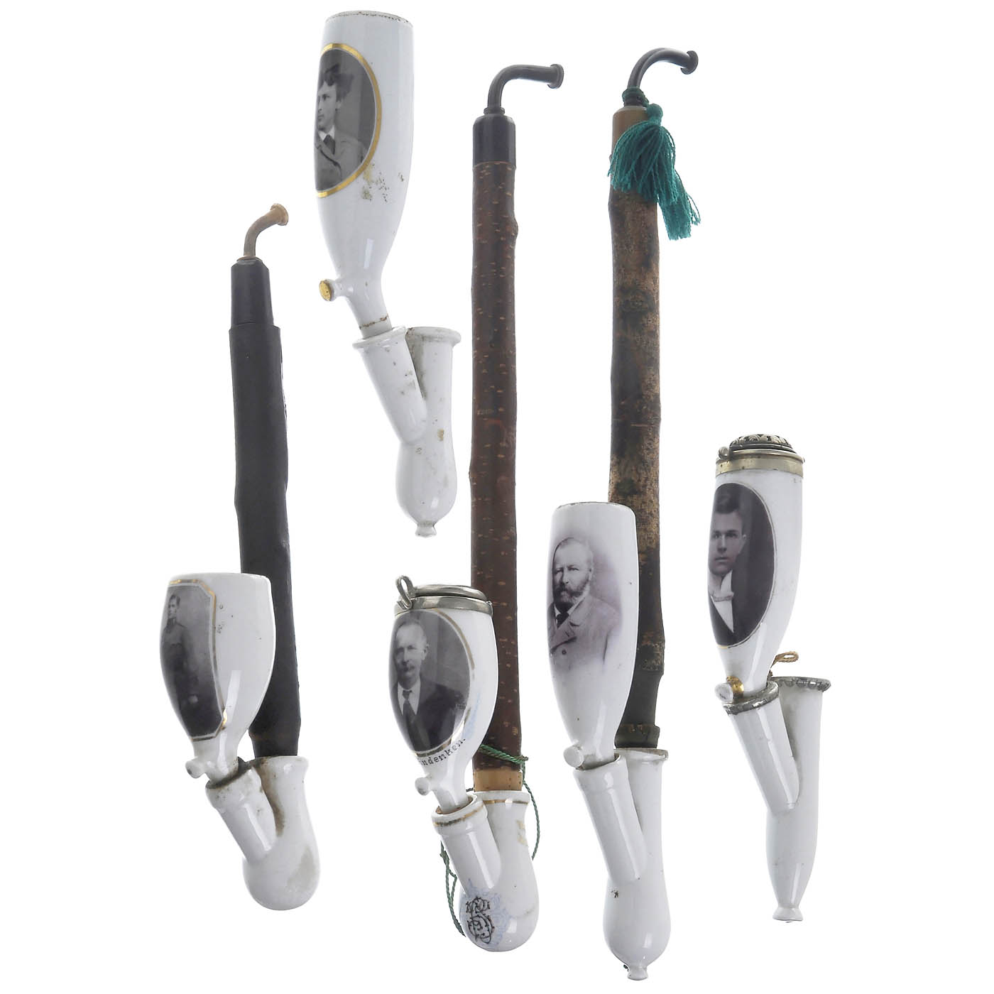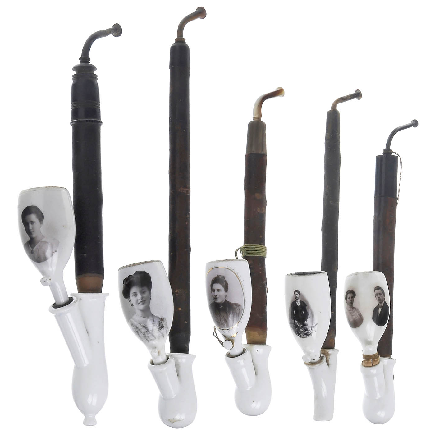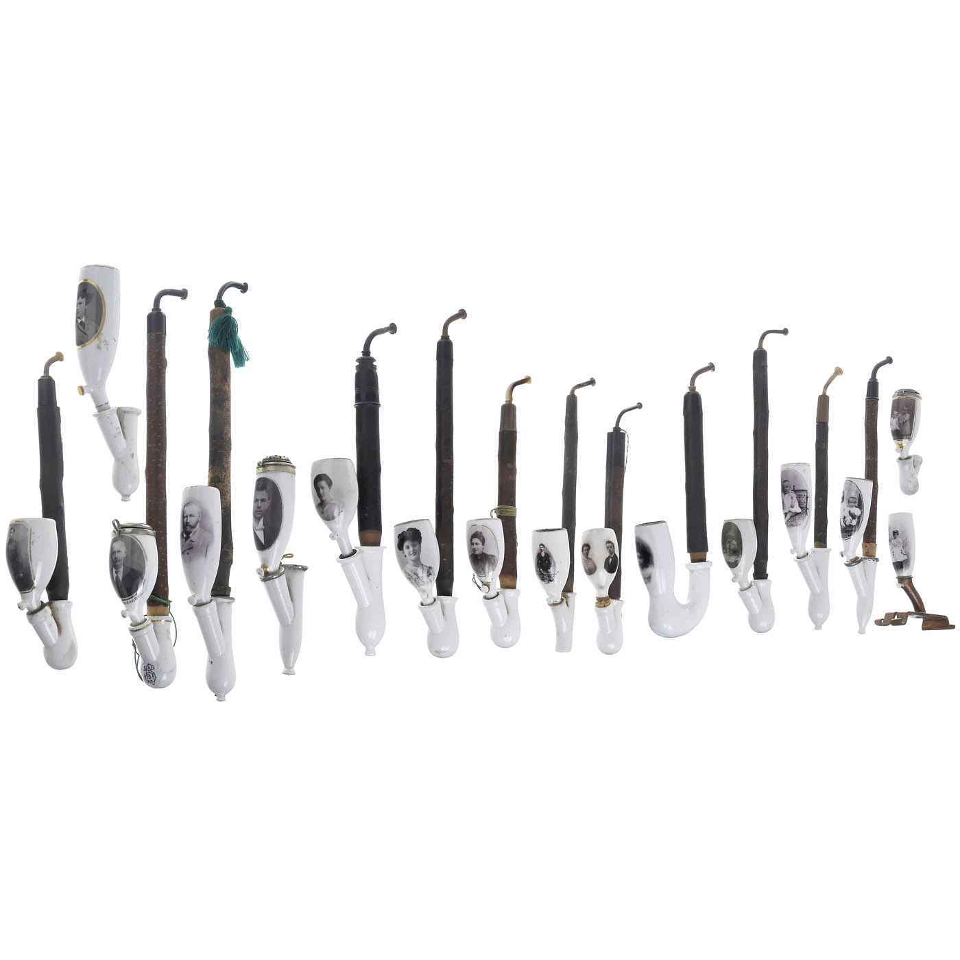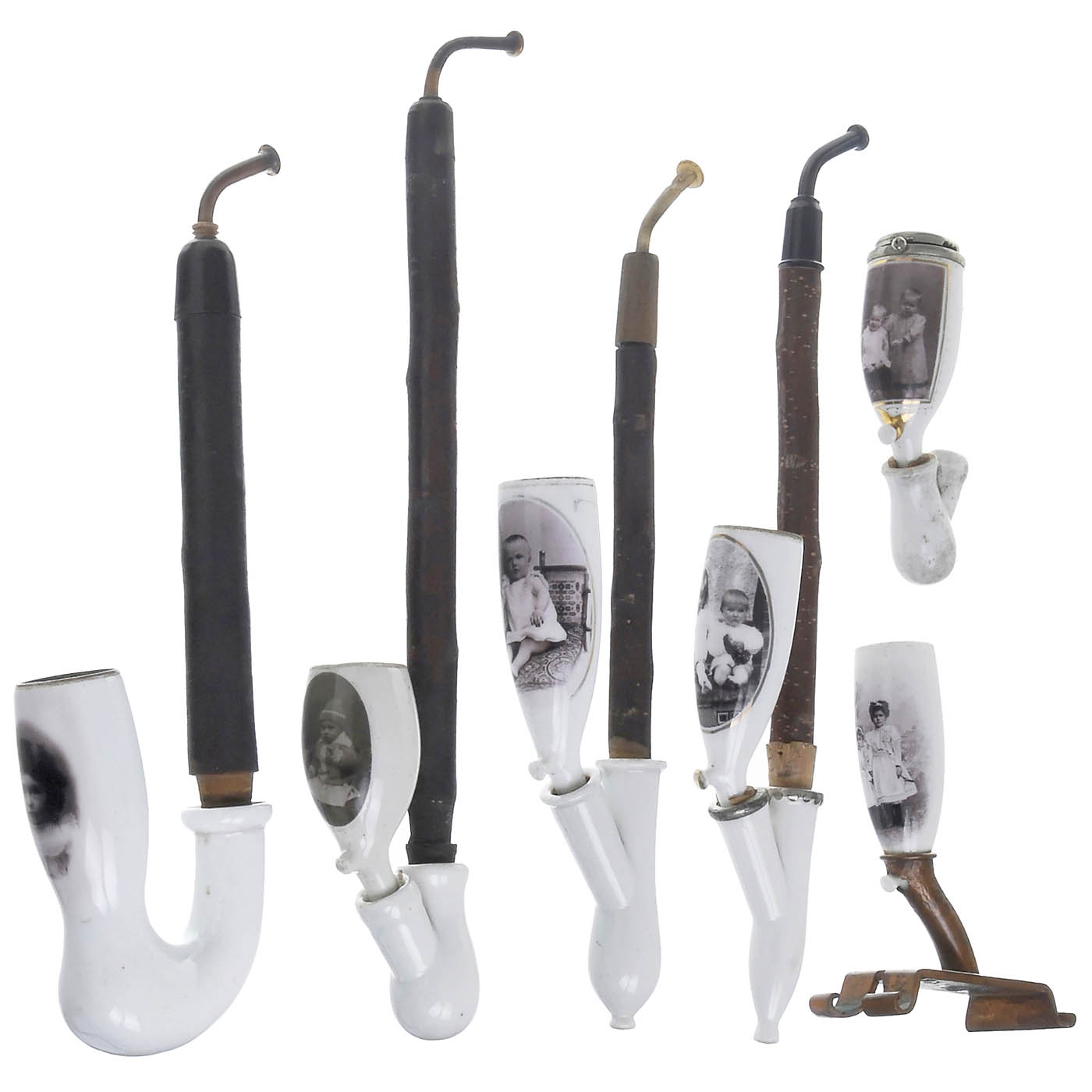 Extremely rare porcelain pipes with portrait photographs. With 12 tips and 1 ornamental holder. Interesting is the sociological statistic of smokers and passive smokers: 5 men, 5 women, 6 children and a couple.